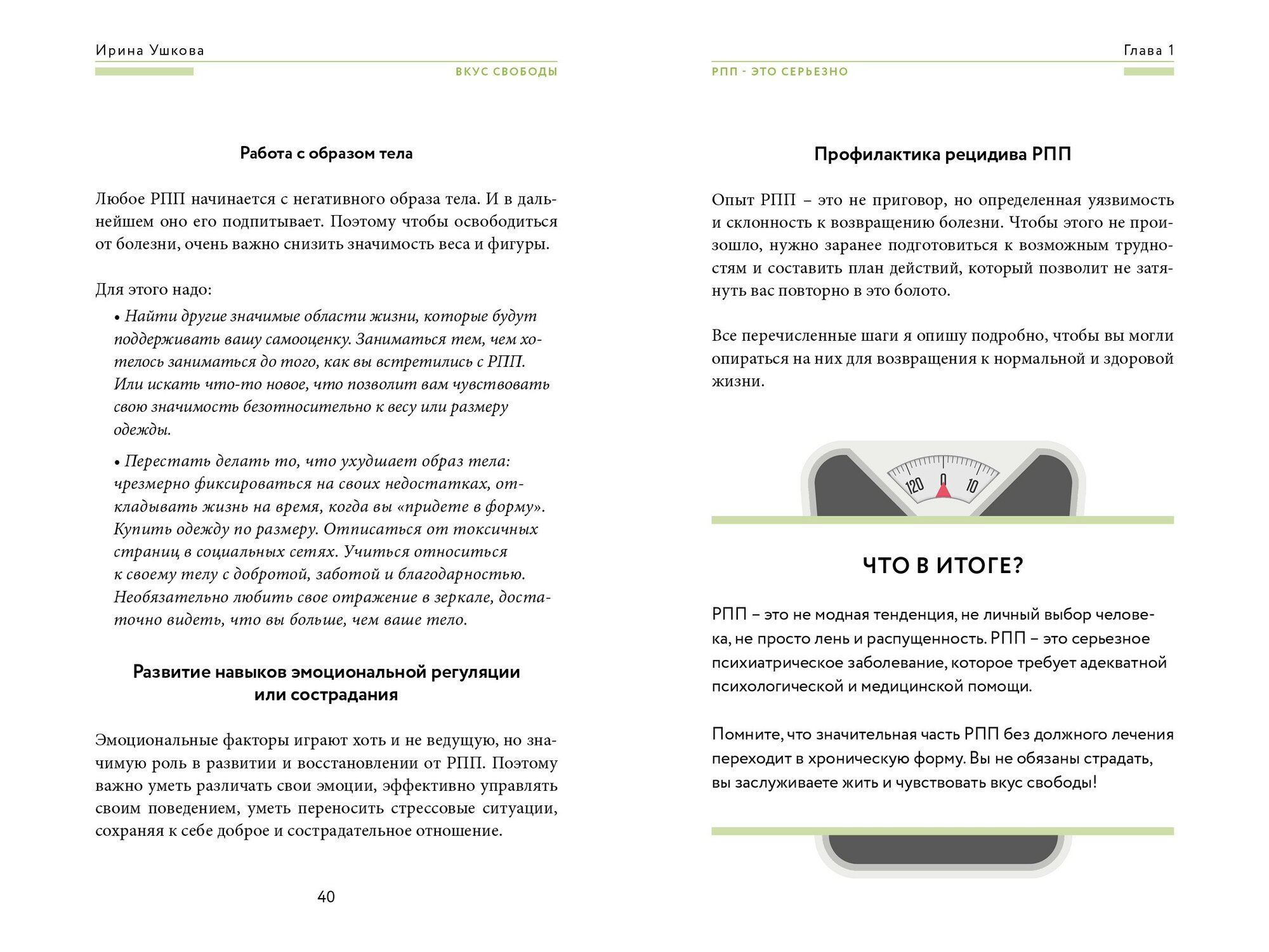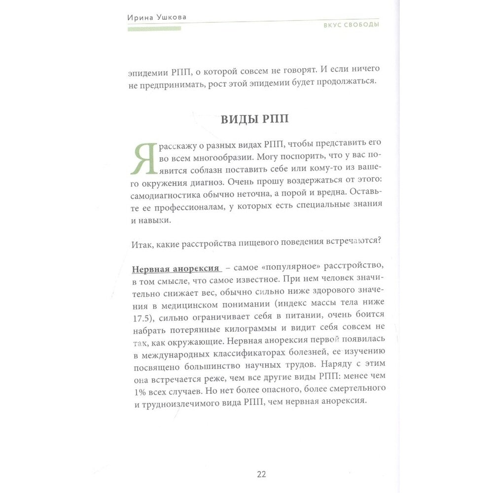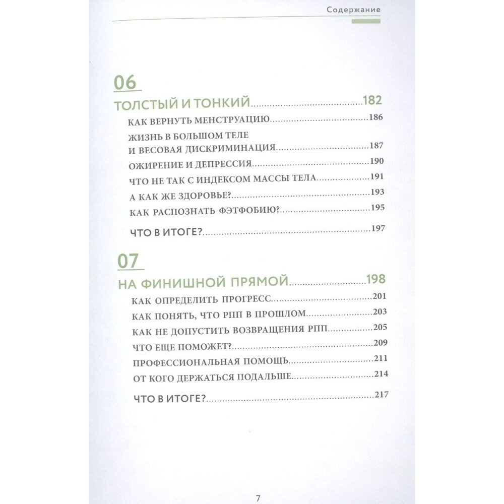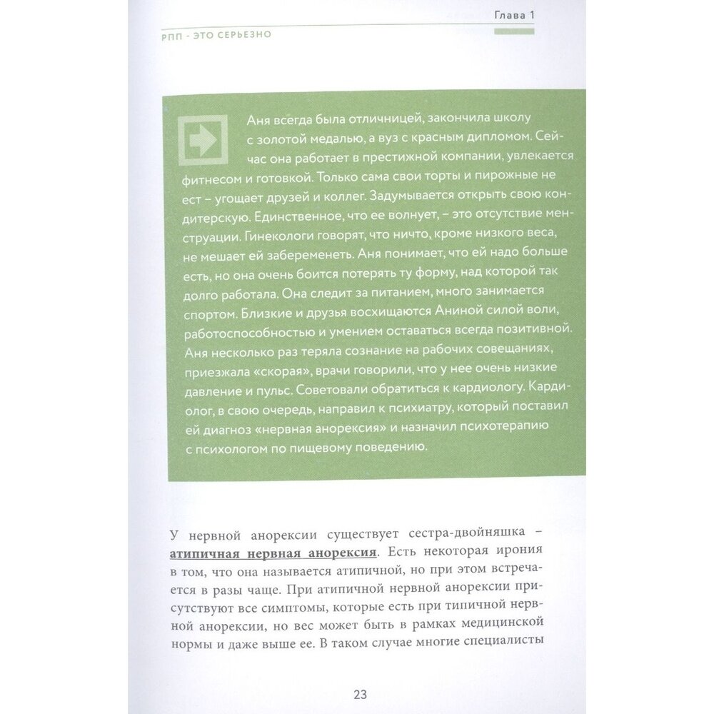 Не понаслышке знаю о расстройствах пищевого поведения: моя близкая подруга страдает от компульсивных перееданий. Очень ждала эту книгу, чтобы подарить ей. Комплексно и полно автор рассказывает не только про виды РПП, но и о том, как они возникают и как с ними бороться, как отследить прогресс и как вести себя в ремиссии. Полезной прикладной информации очень много. Особенно заинтересовали главы из раздела по улучшению отношений с телом, ведь РПП — это заболевание не только соматическое, но и психическое.