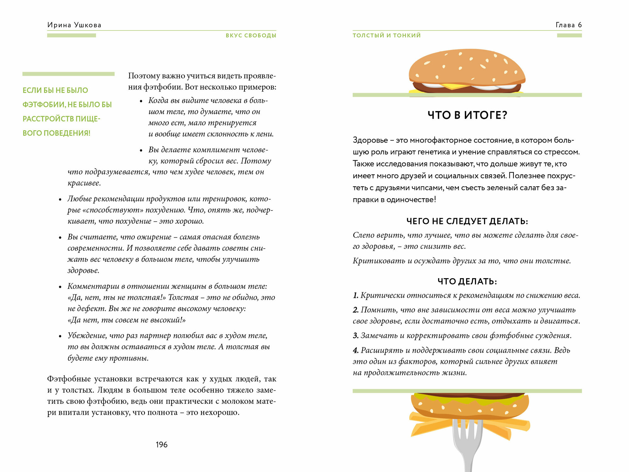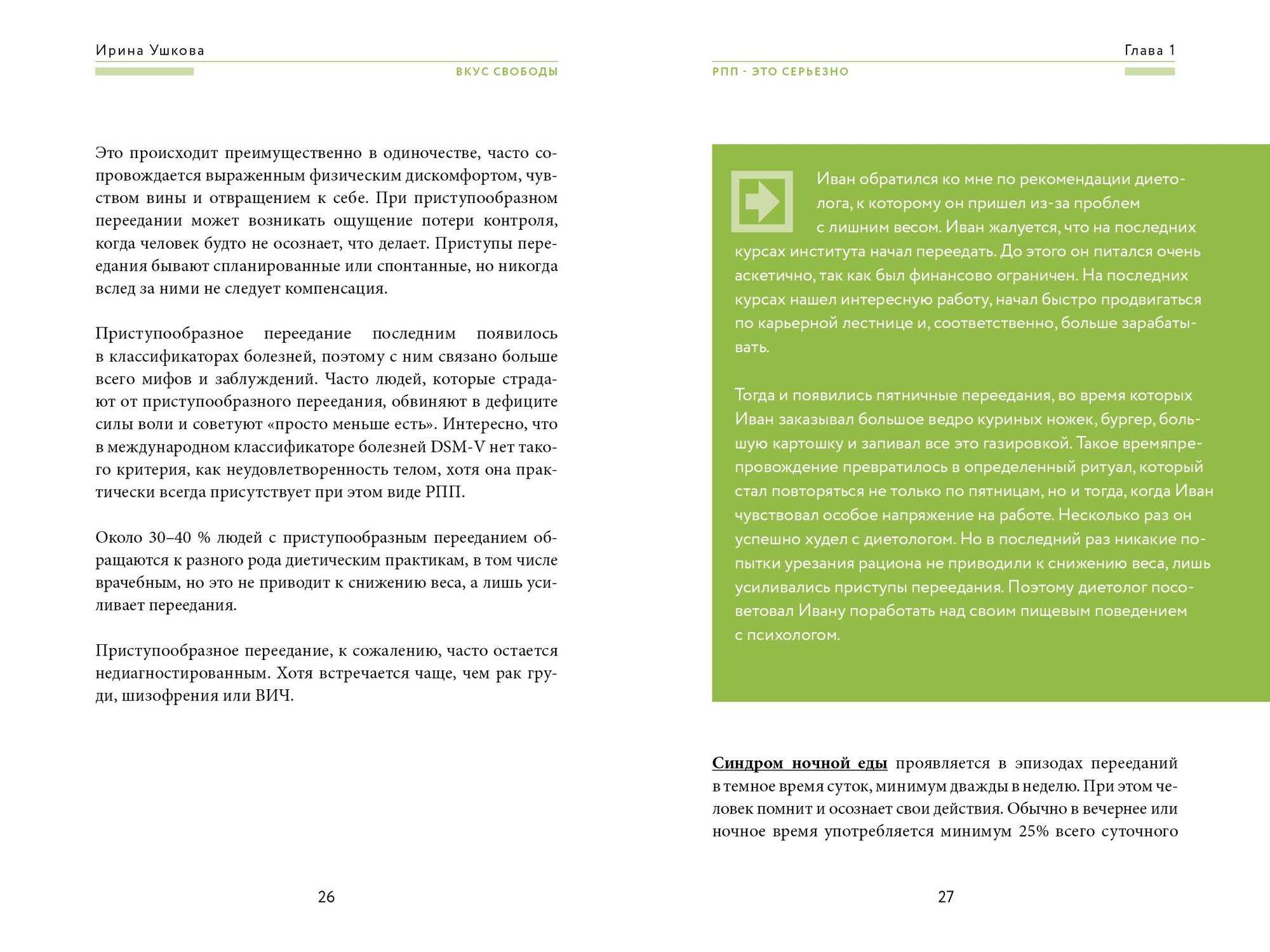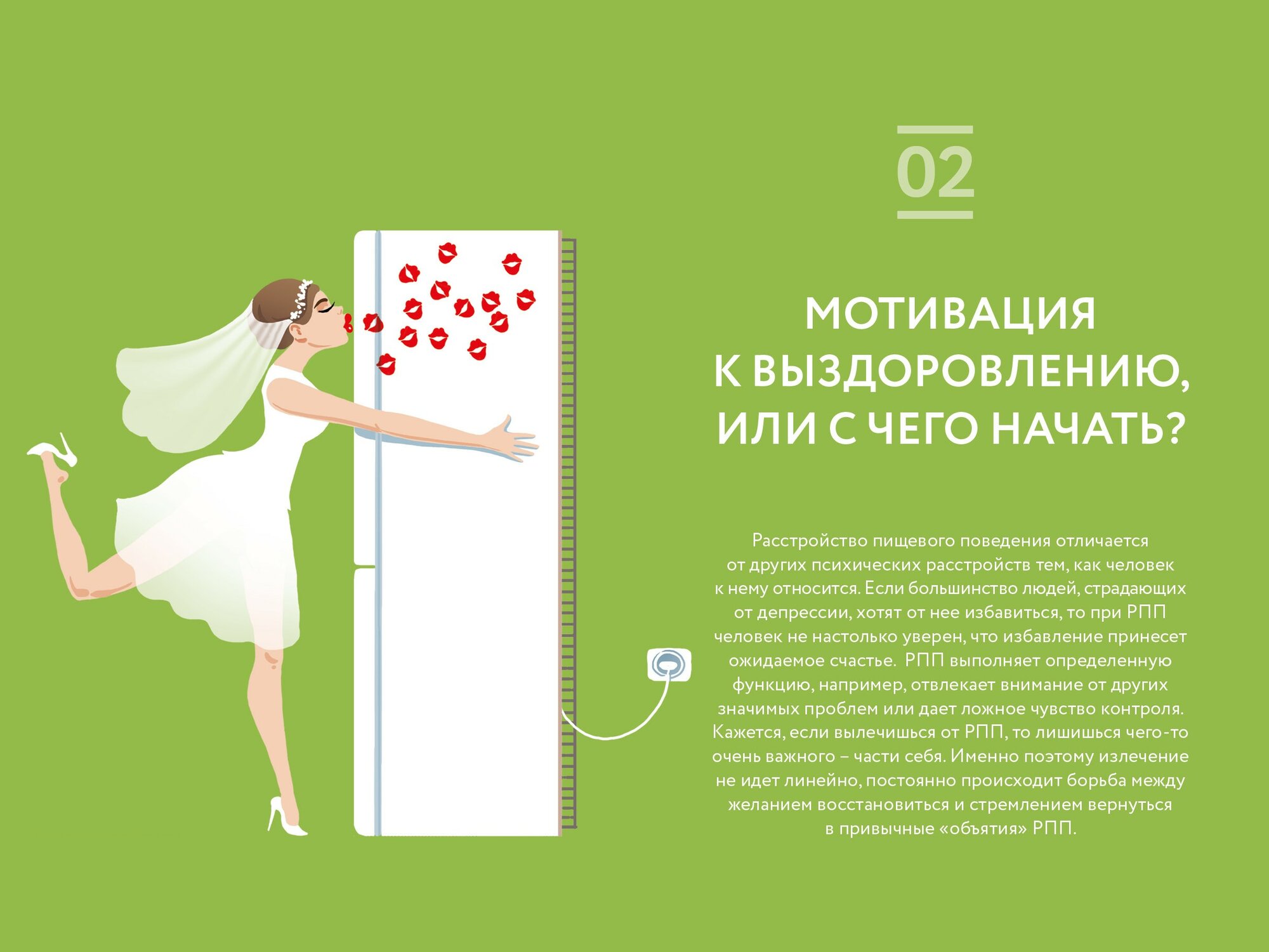 Не понаслышке знаю о расстройствах пищевого поведения: моя близкая подруга страдает от компульсивных перееданий. Очень ждала эту книгу, чтобы подарить ей. Комплексно и полно автор рассказывает не только про виды РПП, но и о том, как они возникают и как с ними бороться, как отследить прогресс и как вести себя в ремиссии. Полезной прикладной информации очень много. Особенно заинтересовали главы из раздела по улучшению отношений с телом, ведь РПП — это заболевание не только соматическое, но и психическое.