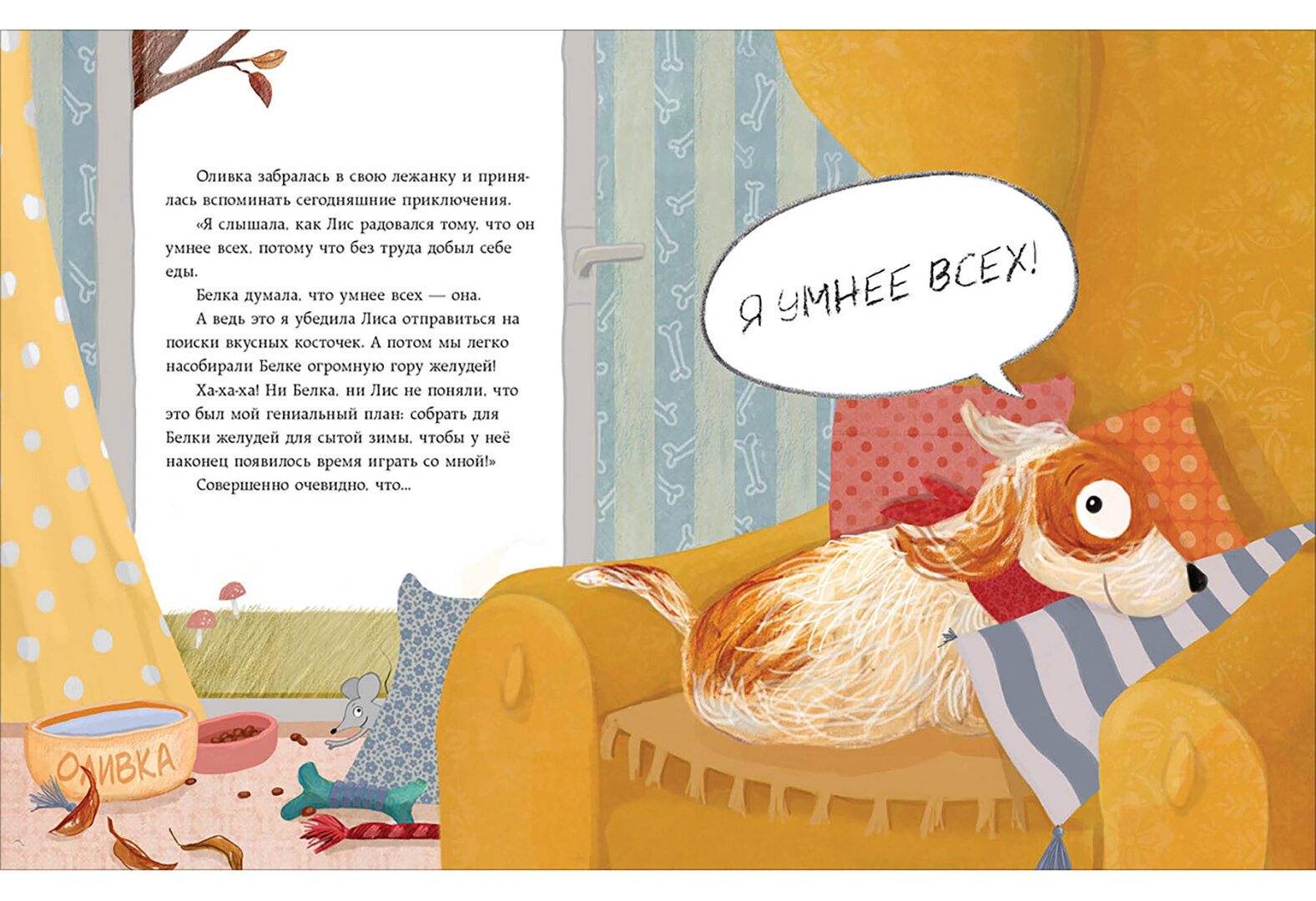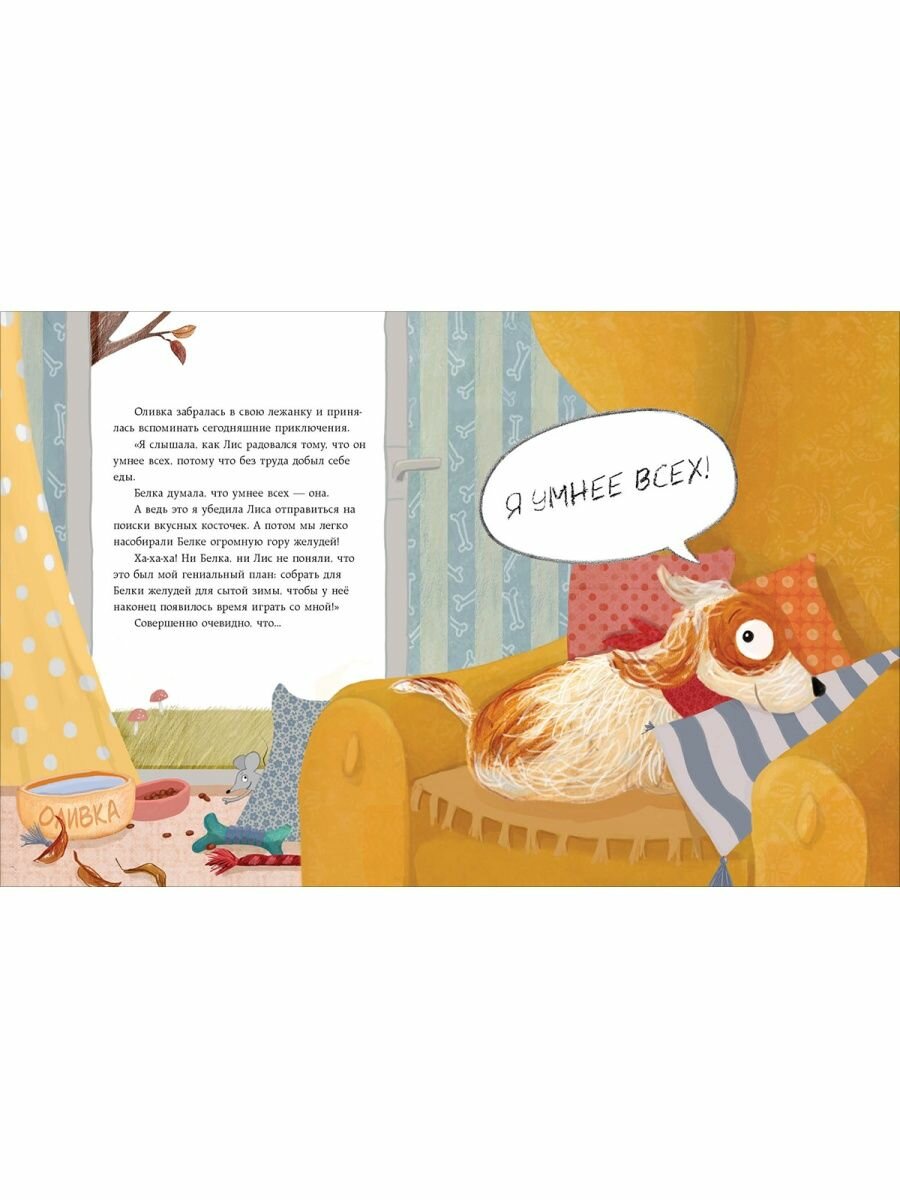 Собачка Оливка очень любит гоняться за маленькой Белочкой. Но у рыжей подружки совсем нет времени на игры: ей надо запасать жёлуди на зиму. А тут ещё и голодный Лис появился в лесу. Что же сделать, чтобы все остались довольны? Кто из друзей окажется умнее всех?