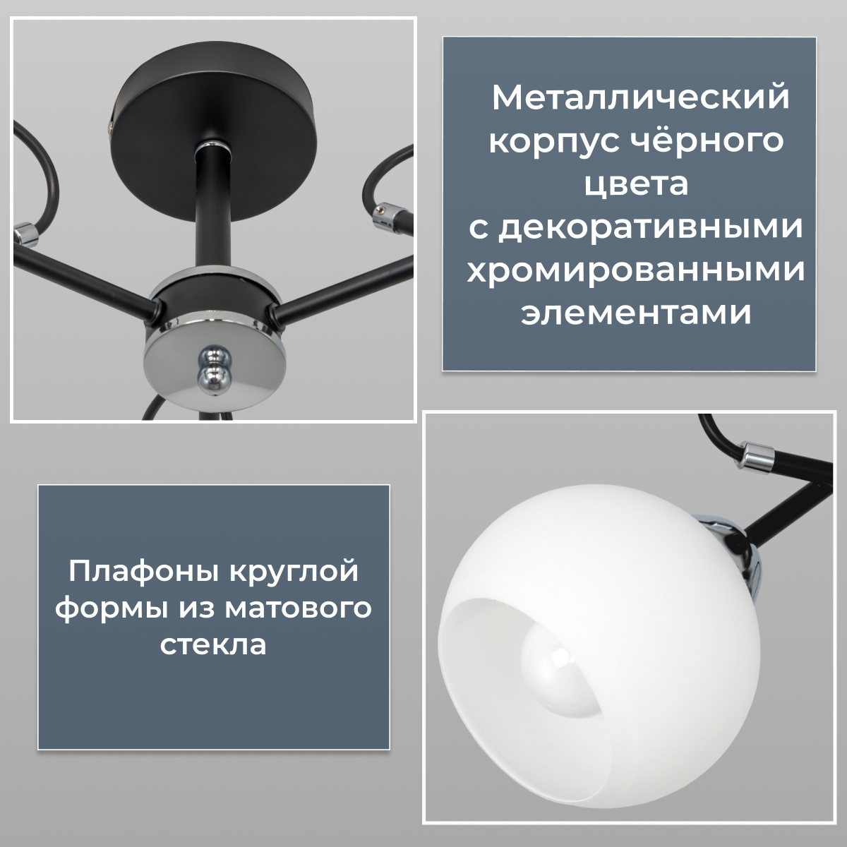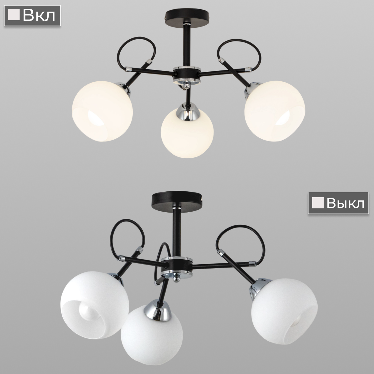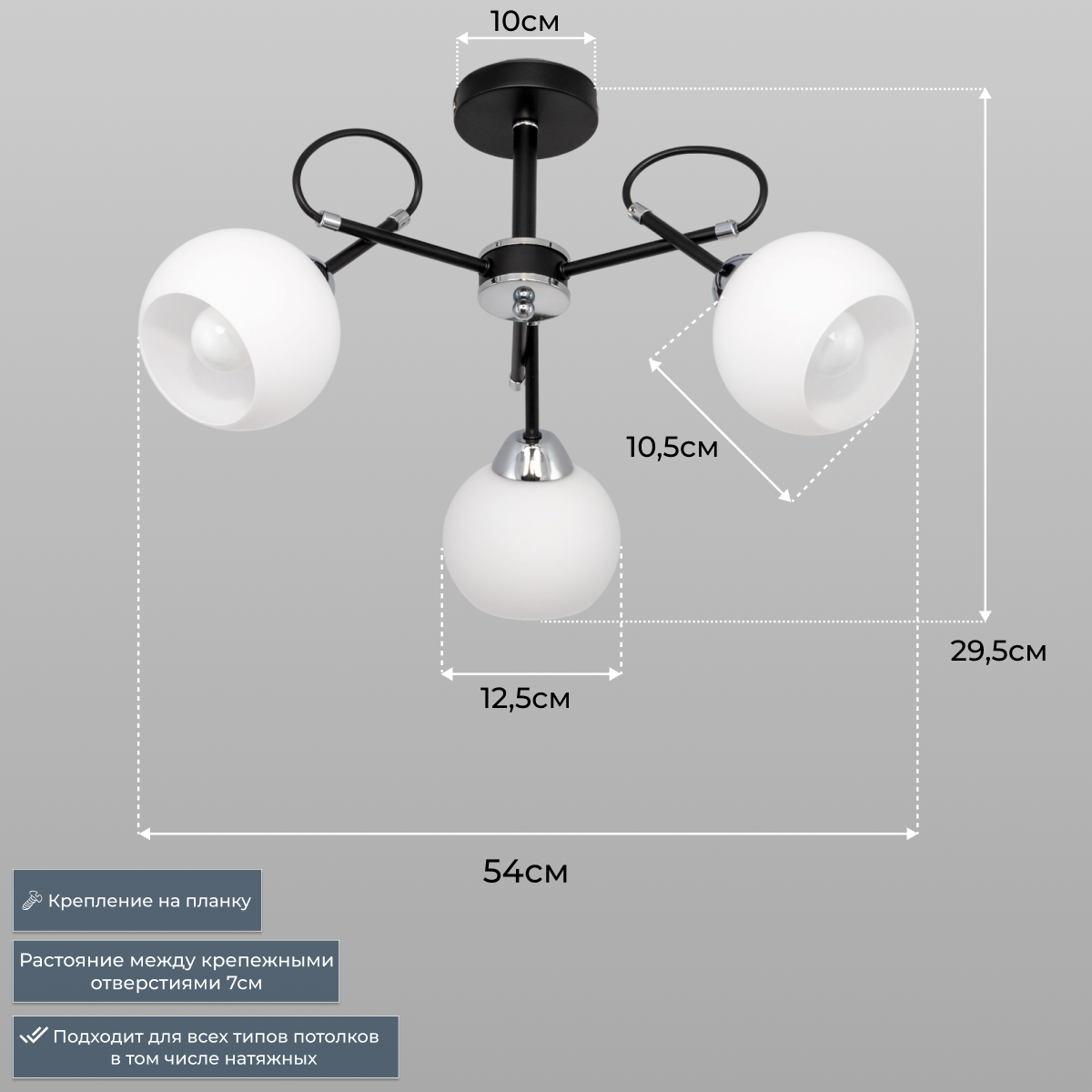 Корпус трехрожкового светильника металлический, чёрного цвета, с декоративными хромированными элементами. Плафоны круглой формы, изготовлены из матового стекла. В изделии используются лампы с цоколем Е27, максимальной мощностью для ламп накаливания 75Вт. Светодиодные лампы можно устанавливать более яркие. Поставляется в компактной упаковке в разобранном виде. Крепёж и подробная инструкция в комплекте. Подходит для всех типов потолков, в том числе натяжных, тип крепления — планка.