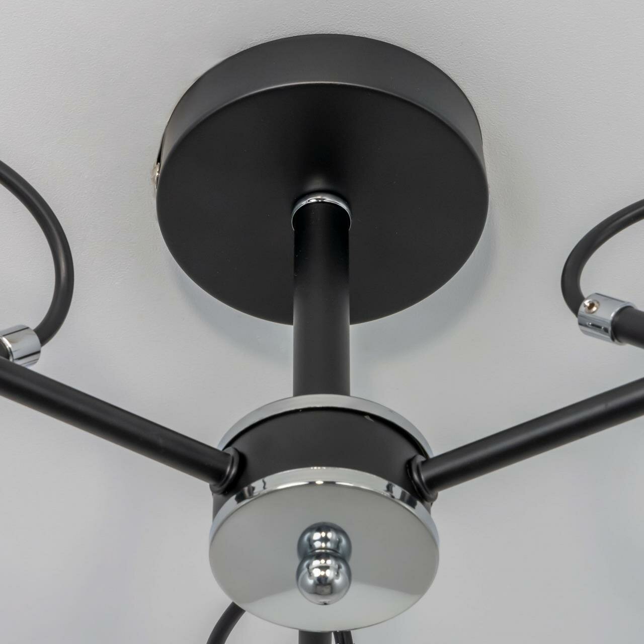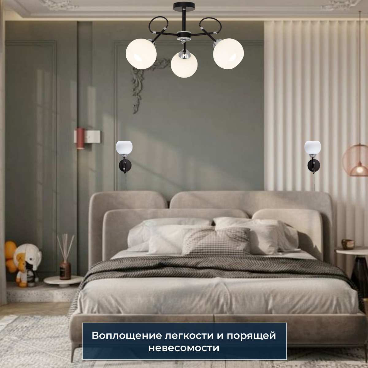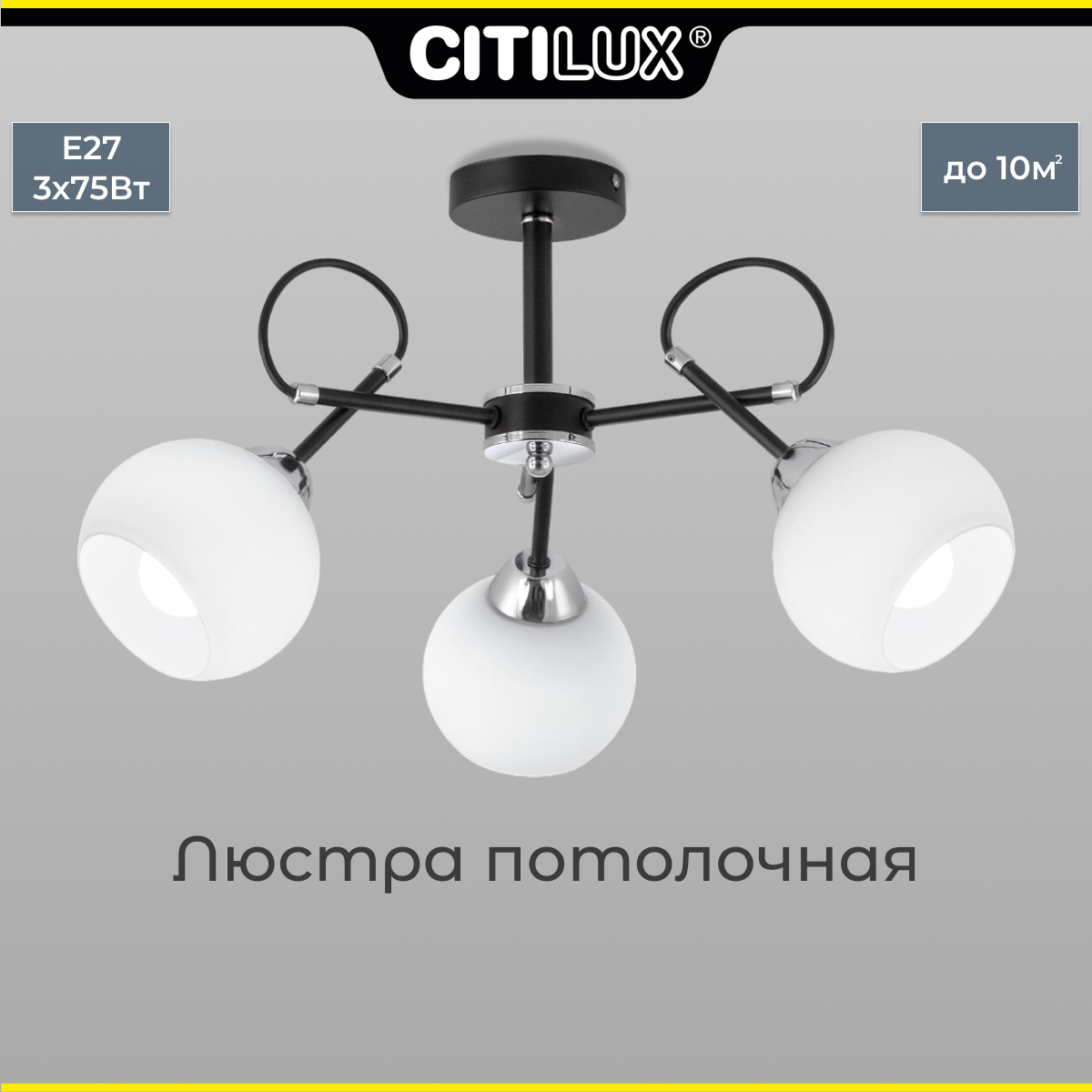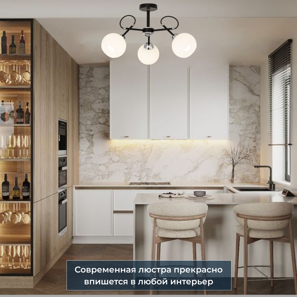Корпус трехрожкового светильника металлический, чёрного цвета, с декоративными хромированными элементами. Плафоны круглой формы, изготовлены из матового стекла. В изделии используются лампы с цоколем Е27, максимальной мощностью для ламп накаливания 75Вт. Светодиодные лампы можно устанавливать более яркие. Поставляется в компактной упаковке в разобранном виде. Крепёж и подробная инструкция в комплекте. Подходит для всех типов потолков, в том числе натяжных, тип крепления — планка.