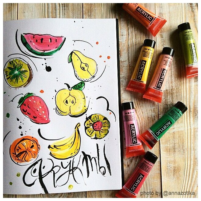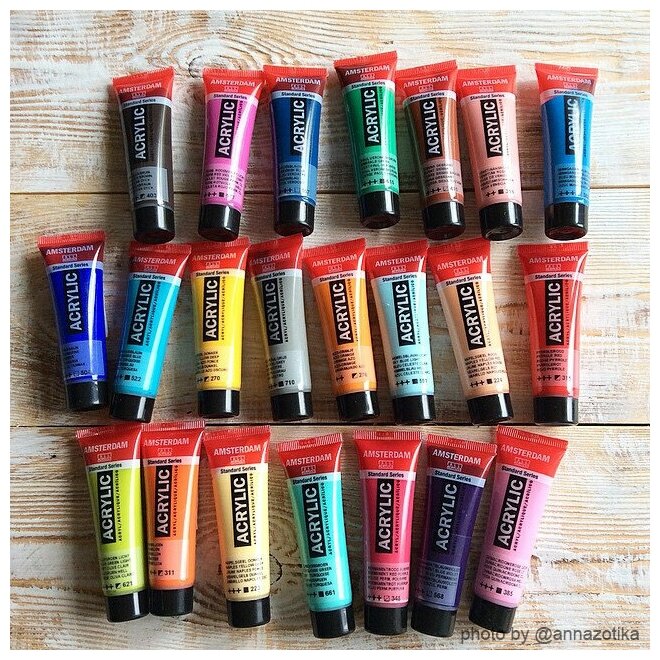 Акрил AMSTERDAM представлен широкой палитрой из 90 цветов, среди которых есть металлические и светоотражающие цвета. Выпускается поштучно в пластиковых тубах по 20 и 120 миллилитров, также в ассортименте присутствуют наборы различной комплектации.