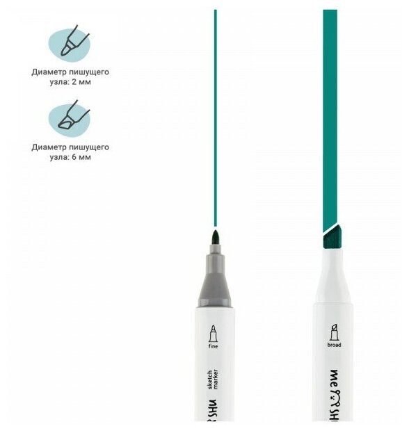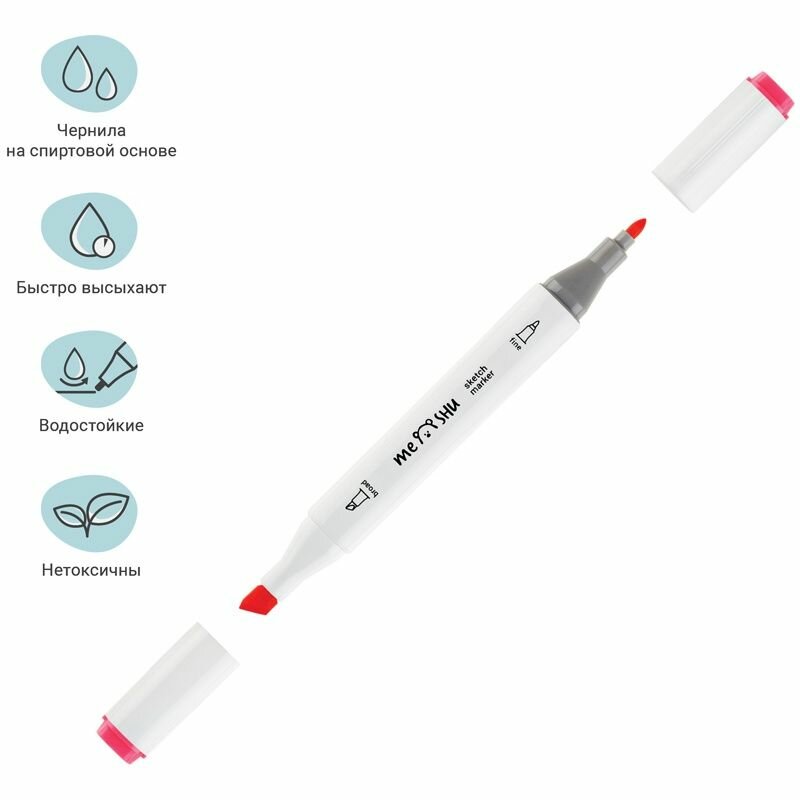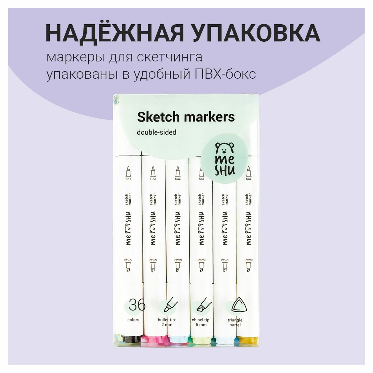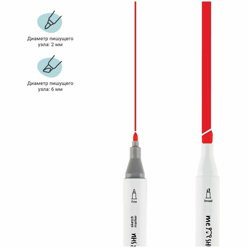 Набор двусторонних маркеров для скетчинга Meshu — идеальный выбор для художников, дизайнеров, иллюстраторов и любителей скетчинга, подходят для создания аниме и манги. Эргономичный трехгранный корпус удобно лежит в руке и позволяет эффективно прорабатывать мелкие детали рисунка. Чернила на спиртовой основе — быстро высыхают, водостойкие, нетоксичны и не портят поверхность бумаги. Маркеры обладают пулевидным (2мм.) и скошенным (6 мм.) наконечниками, что позволяет прорабатывать как мелкие детали рисунка, так и закрашивать большие области.
