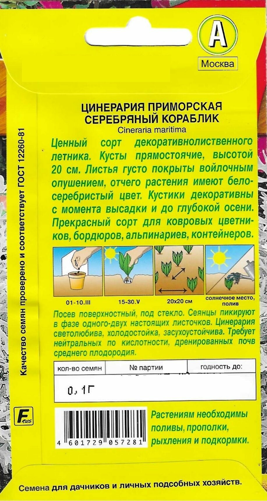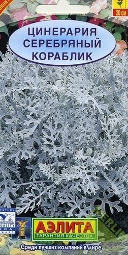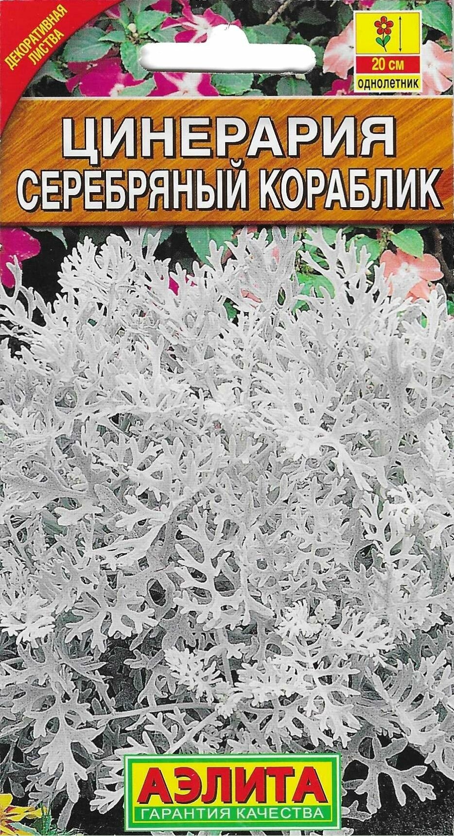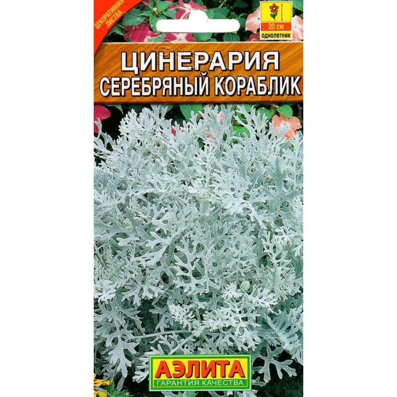 Цинерария «Серебряный кораблик» — семена растения, с помощью которого часто создают бордюры и миксбордеры, обрамляют дорожки и подчёркивают цветники. Внешне сорт напоминает декоративный полукустарник высотой около 20-30 см с изящными листьями серебристого оттенка из-за войлочного опушения. Его принято считать многолетником, но выращивается всё-таки, как однолетник на нейтральных дренированных почвах среднего плодородия. Высеивается на рассаду в начале марта, потом пикируется, а высаживается в грунт уже в мае.