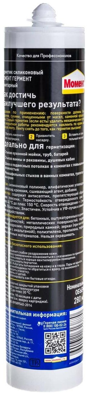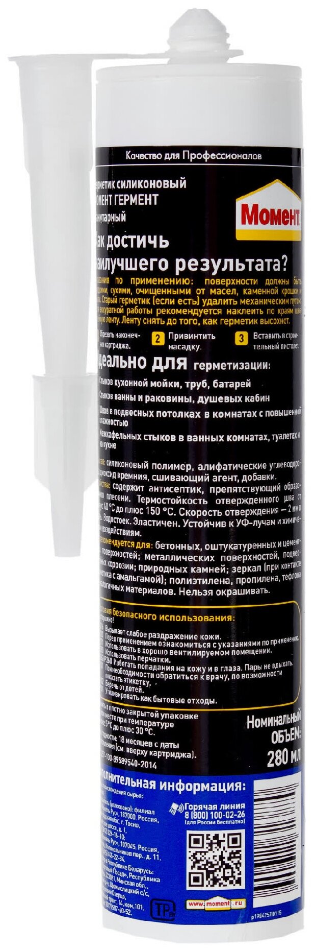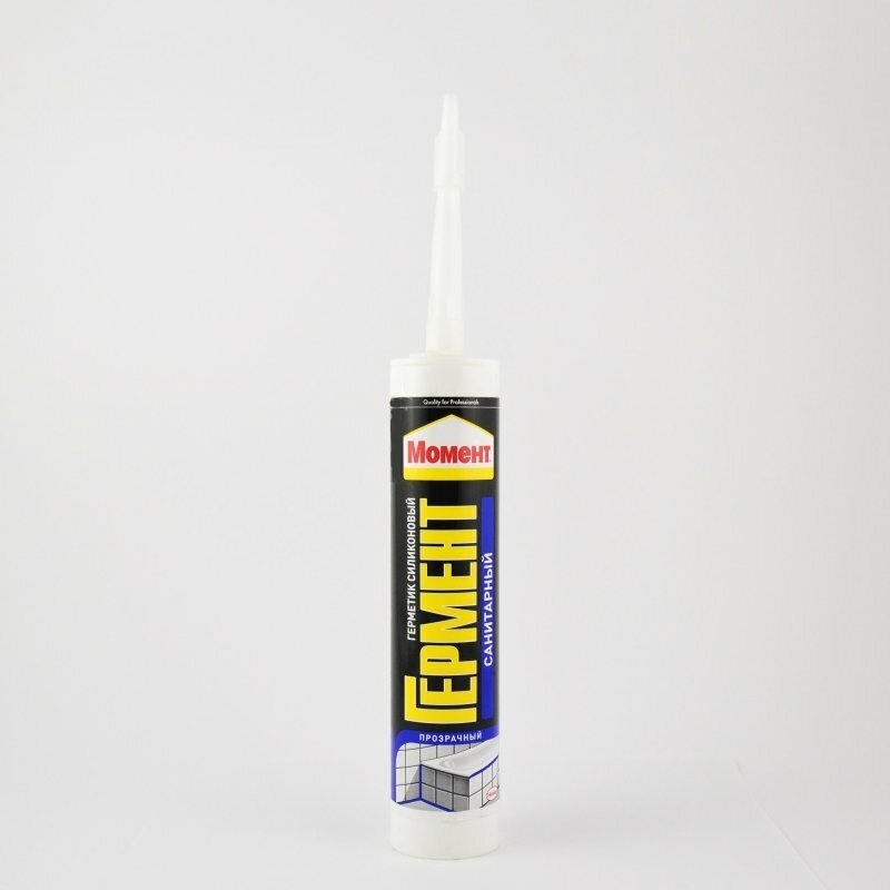 Герметик силиконовый санитарный «Момент Гермент» - универсальный однокомпонентный герметик на основе силиконового полимера (ацетокси) для герметизации и заполнения швов и стыков. Предназначен для использования в помещениях с повышенной влажностью: ванных комнатах, душевых кабинах, туалетных комнатах, кухнях, при остеклении и т.д. Применим при общих строительных и ремонтных работах как внутри, так и снаружи помещения. Содержит антисептическое средство, препятствующее образованию плесени.