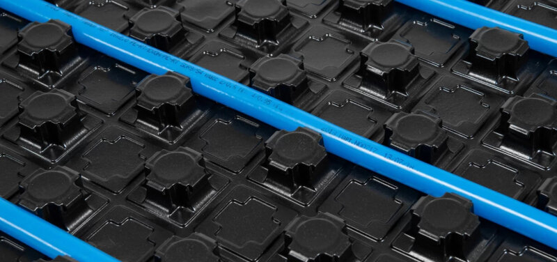 **Пенополистирол Knauf Therm Pro** представляет собой формованные маты из пенополистирола, покрытые жесткой PS-пленкой. Используются для обустройства водяного теплого пола с шагом расположения труб до 50 мм. Благодаря выступающим элементам трубы плотно фиксируются, а применение сетки, хомутов и других крепежей не требуется. Дополнительная прочность покрытия обеспечивается плотной полистирольной пленкой. Она защищает от влаги и других негативных воздействий окружающей среды.