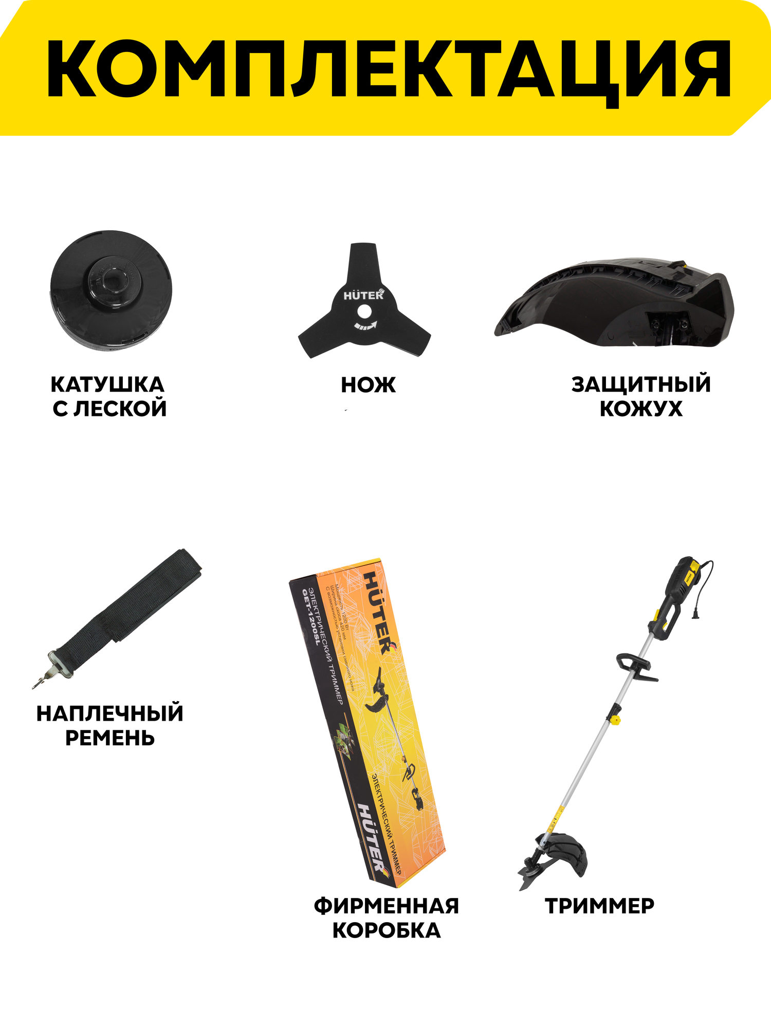 Триммер электрический Huter GET-1200 — мощный, высокопроизводительный прибор для срезания густой травы с сорняками. Рекомендуемая площадь обработки — 350 м^2^. Работает от сети 220 В, длина сетевого кабеля — 1 м. Мощность — 1,2 кВт.