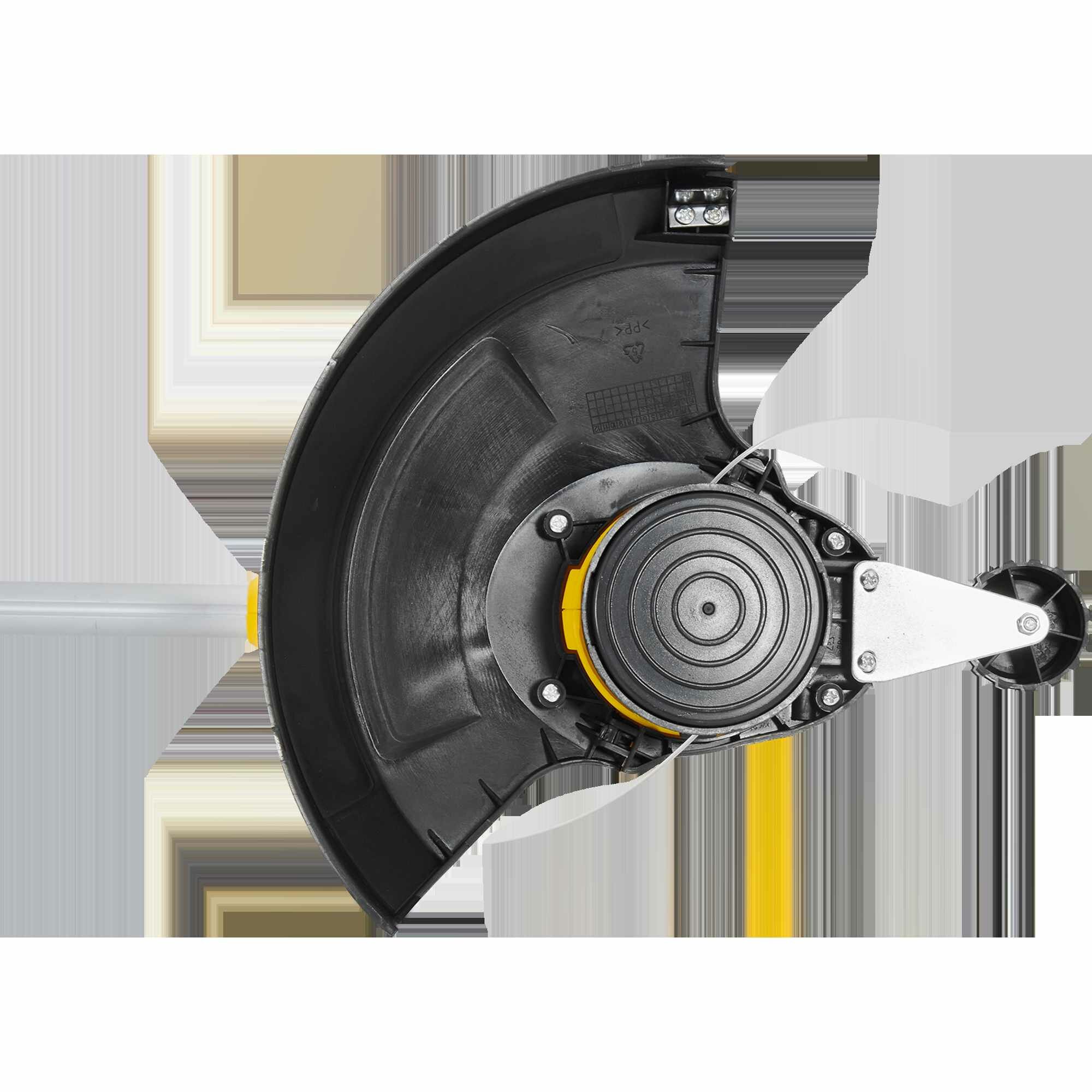 Режущий элемент — леска. В комплект входит катушка 20 м. Два отверстия для лески обеспечивают равномерное и быстрое скашивание травы (ширина захвата — 32 см). Модель оснащена регулируемой металлической штангой.
