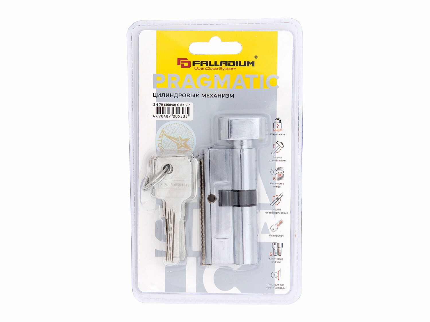**Цилиндр Palladium BK CP** типа «ключ-вертушка» — механизм для защиты от взлома входной двери. Изготовлен из латуни, имеет никелированное покрытие для высокой износоустойчивости. Цилиндровые штифты сделаны из высокопрочной стали. Механизм оснащен пинами с секретными комбинациями и блокировочными пинами для защиты от взлома методом подбора кода или отмычками. Может использоваться совместно с броненакладками. Цилиндр замка прост в эксплуатации, надежен и долговечен. Размер цилиндра (внешний и внутренний) — 30 + 40 мм. Цвет — хромированный.