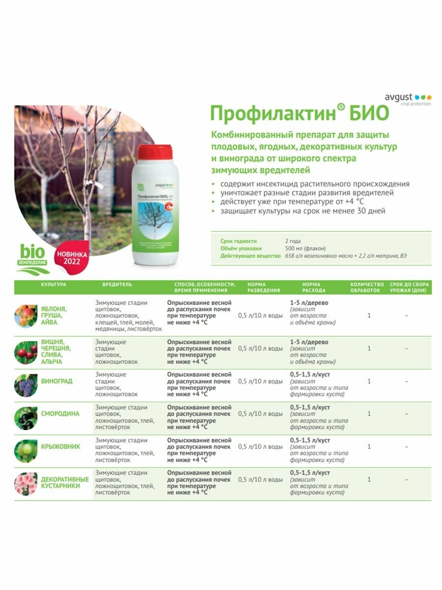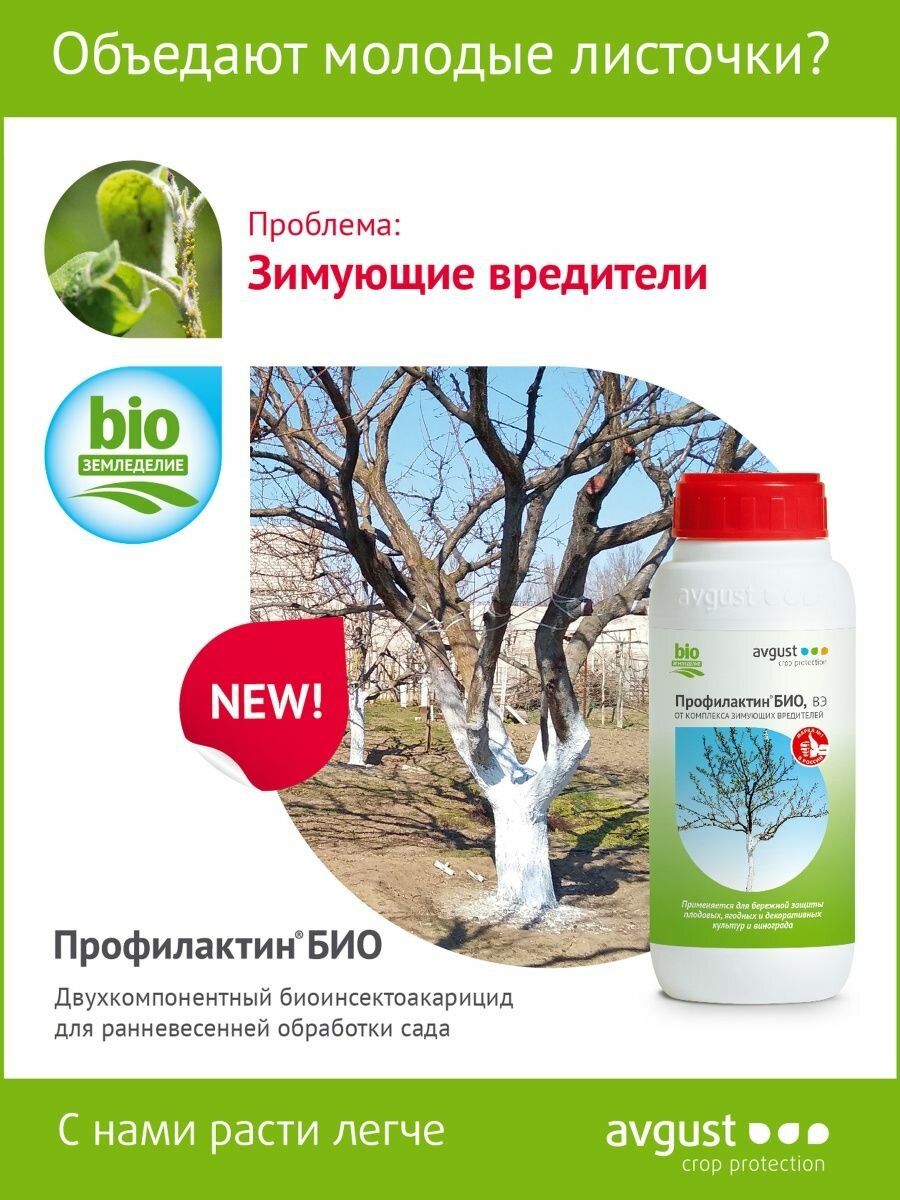 **Средство защиты растений Avgust Профилактин Био от зимующих вредителей 500 мл** - новый биологический препарат для обработки плодовых, ягодных, декоративных культур и винограда от зимующих вредителей.