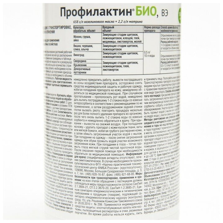| Инструкция по применению | Опрыскивание растений рабочей жидкостью препарата ранней весной до распускания почек. Регламенты применения приведены в таблице на упаковке. Для приготовления рабочей жидкости в резервуар опрыскивателя налить небольшое количество (примерно 1 л) теплой воды, добавить необходимое количество препарата, перемешать до получения однородной эмульсии, долить воду до необходимого объема и еще раз тщательно перемешать. Рабочая жидкость должна быть использована в день приготовления |