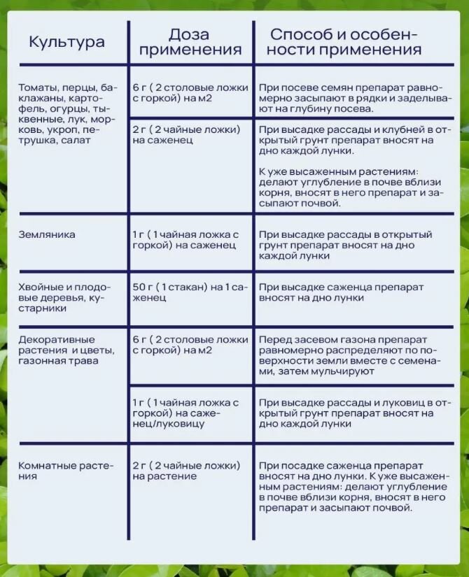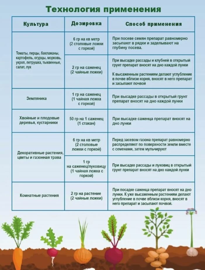 | Способ применения | при посеве семян препарат равномерно засыпают в рядки и заделывают на глубину посева; при высадке рассады и клубней в грунт препарат вносят на дно каждой лунки; при высадке саженца препарат вносят на дно посадочной ямы |