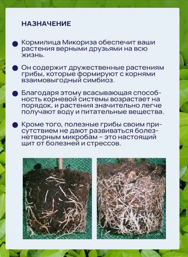 Назначение: Кормилица Микориза содержит дружественные растениям грибы, которые формируют с корнями взаимовыгодный симбиоз. Кормилица Микориза обееспечивает эффективное питание растения: добывает воду и необходимые макро- и микроэлементы, защищает растение от вредителей и болезней, улучшает выживаемость саженцев при пересадке, увеличивает урожайность на 40%.