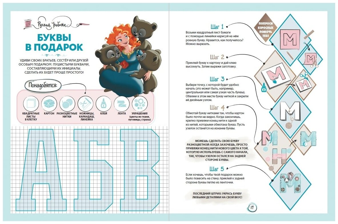 В этой книге столько всего интересного, связанного с принцессами Disney! Истории, занимательные факты, тесты, рецепты, игры.… А ещё пошаговые схемы увлекательных поделок: браслетиков, оригами, маски и карточек доброты. Словом, скучать юным принцессам с этой книгой точно не придётся!
