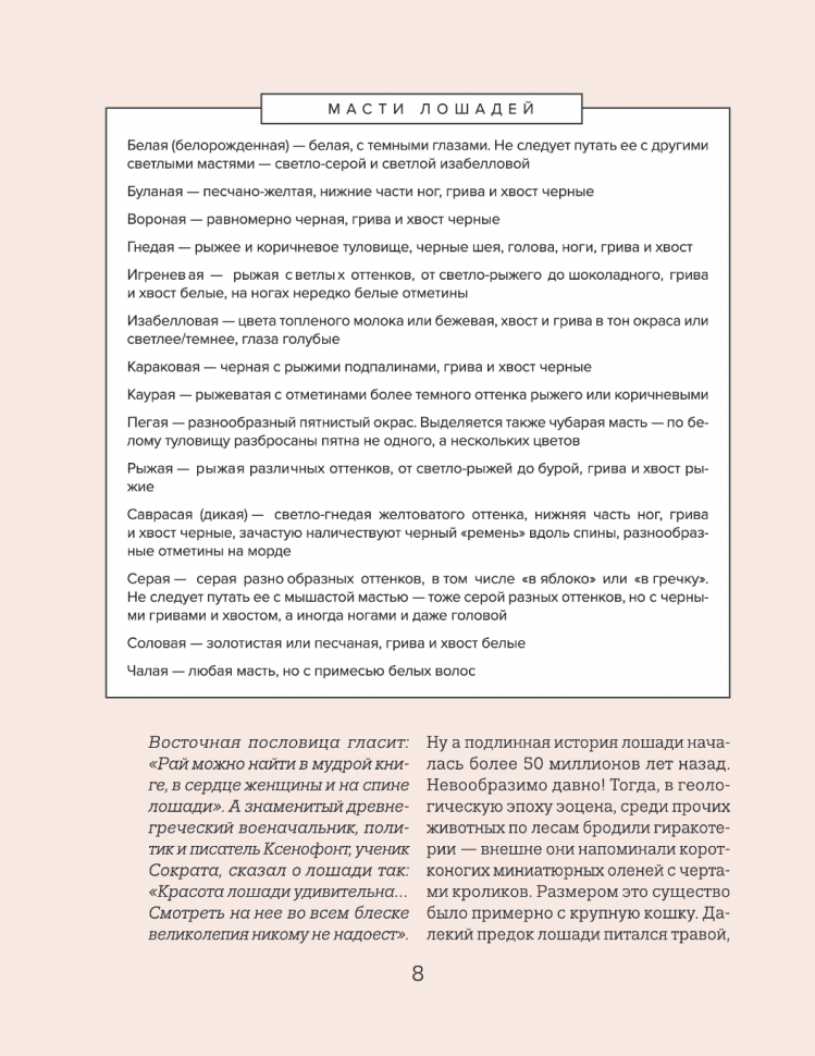 До этой книги я почти ничего не знала о лошадях, поэтому при прочтении почерпнула для себя большое количество совершенно новой информации. Очень интересно и познавательно! Можно сказать, что книга подойдет для людей всех возрастов, однако, в особенности, все же детям и их родителям. Отличное пособие для расширения кругозора!