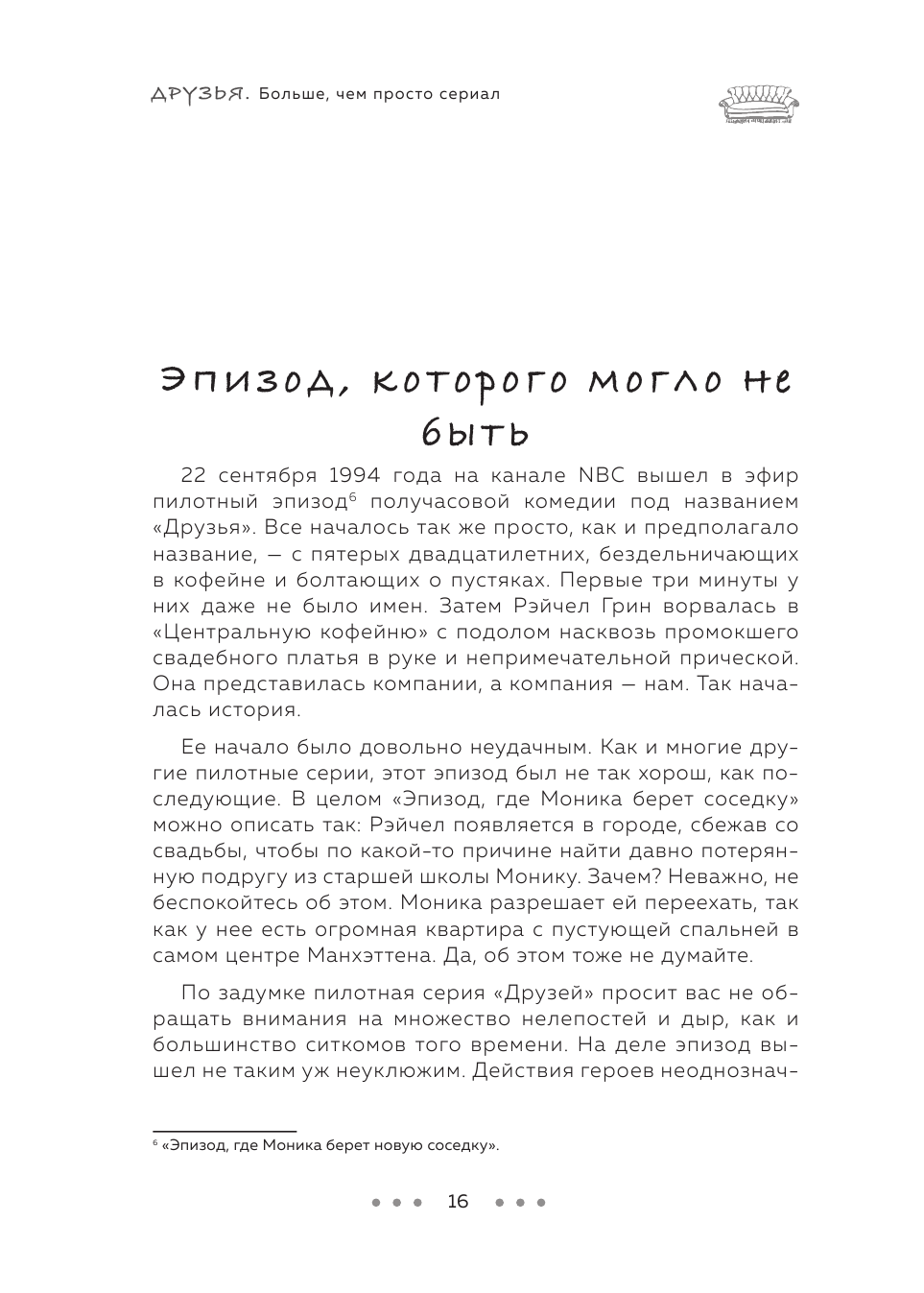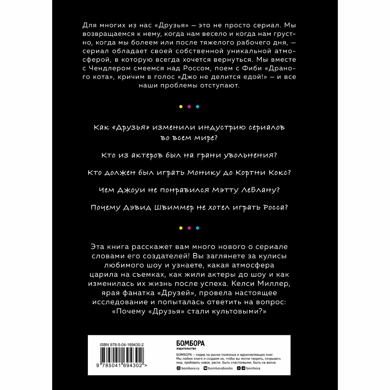 Если вы пересмотрели все сезоны столько раз, что знаете наизусть не только "Драного кота" и шутки про "Росса-разводилу", эта книга точно для вас. Это больше, чем просто рассказ о съемках и интересных фактах, это - самое настоящее исследование популярности сериала. Как ему удалось так долго продержаться на экранах? Как он смог стать частью каждого из нас и сделать почти каждого жителя планеты чуть ближе друг к другу? Ответ прост - авторам удалось создать шестерых друзей для каждого из нас. Мы возвращаемся к сериалу, когда нам весело и когда нам грустно, когда мы болеем или после тяжелого рабочего дня, - сериал обладает своей собственной уникальной атмосферой, в которую всегда хочется вернуться. И эта книга расскажет вам чуть больше о создании сериала словами его создателей! Автор берет вас с собой за кулисы вашего любимого шоу и рассказывает то, о чем вы раньше не знали и, может, даже не задумывались.