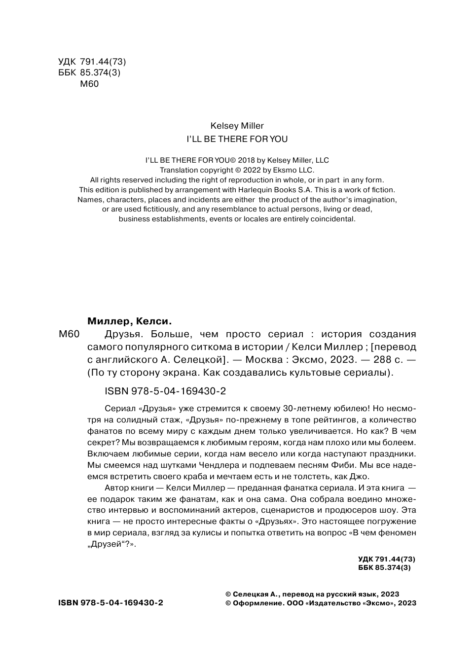 Келси Миллер - преданная фанатка сериала. И эта книга - ее подарок таким же фанатам, как и она сама. Она собрала воедино множество интервью и воспоминаний актеров, сценаристов и продюсеров шоу. Эта книга - не просто интересные факты о "Друзьях". Это настоящее погружение в мир сериала, взгляд за кулисы и попытка ответить на вопрос: "В чем феномен "Друзей"?"