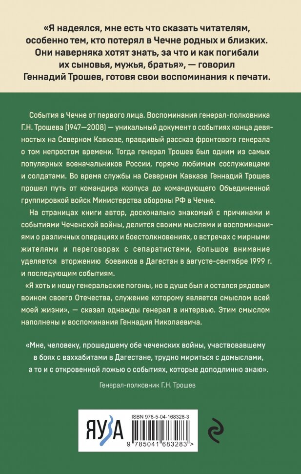 События в Чечне от первого лица. Воспоминания генерал-полковника Г.Н. Трошева (1947—2008) — уникальный документ о событиях конца девяностых на Северном Кавказе, правдивый рассказ фронтового генерала о том непростом времени. Тогда генерал Трошев был одним из самых популярных военачальников России, горячо любимым сослуживцами и солдатами. Во время службы на Северном Кавказе Геннадий Трошев прошел путь от командира корпуса до командующего Объединённой группировкой войск Министерства обороны РФ в Чечне.