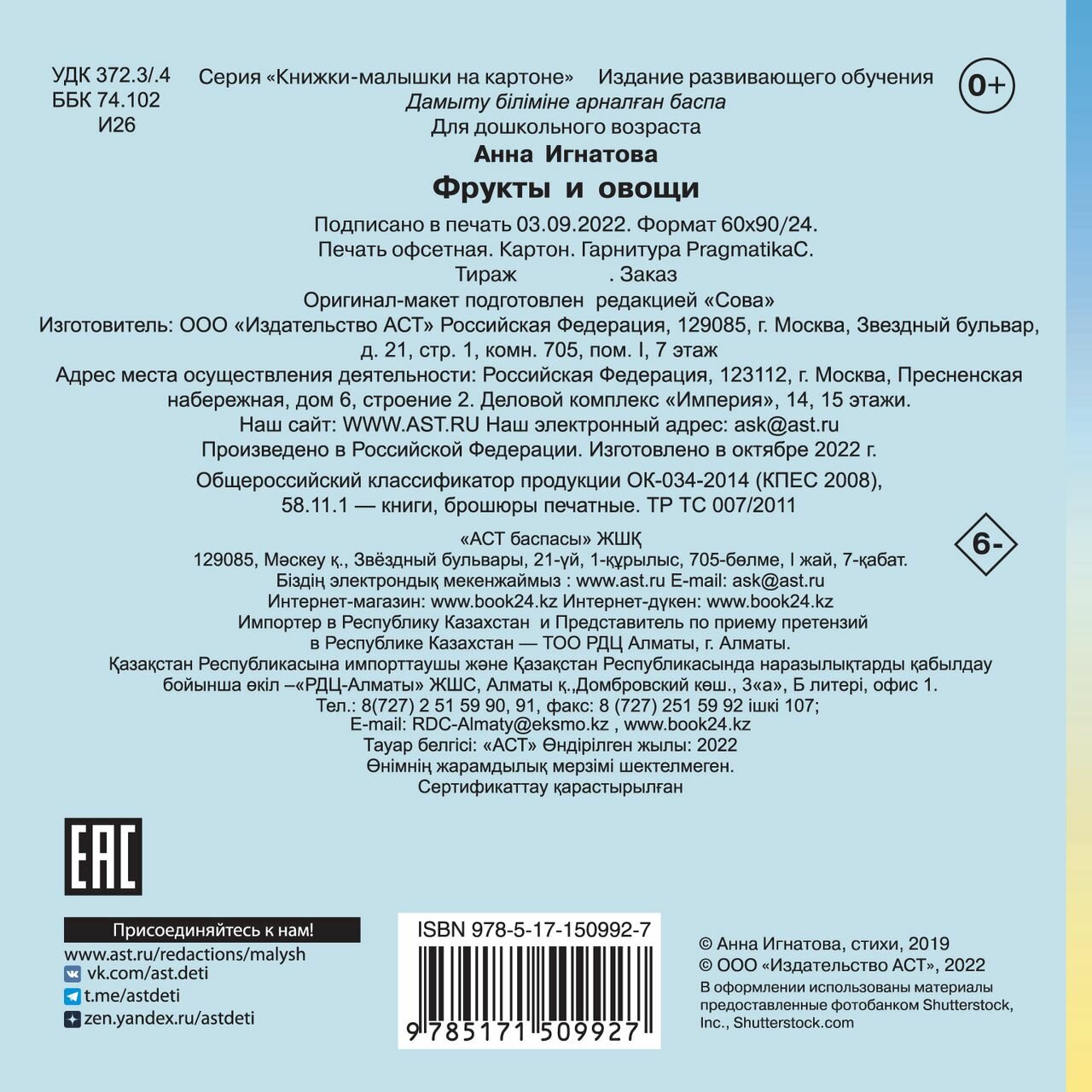 Книга: Фрукты и овощи (Игнатова Анна Сергеевна); Сова. Малыш (Обучающая и развивающая литература), 2022
