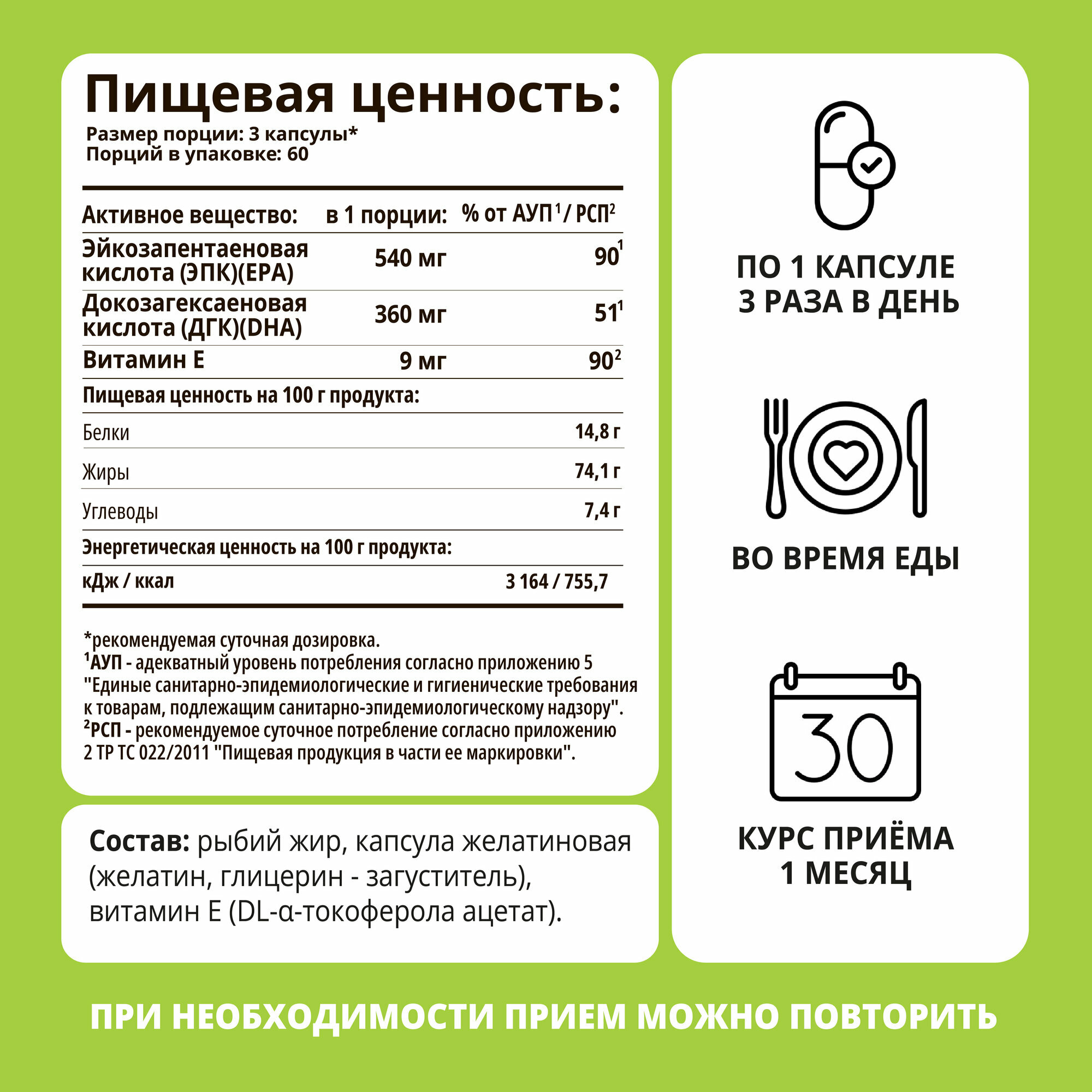 | Состав | рыбий жир, капсула желатиновая (желатин, глицерин - загуститель), витамин Е (DL-α-токоферола ацетат). |