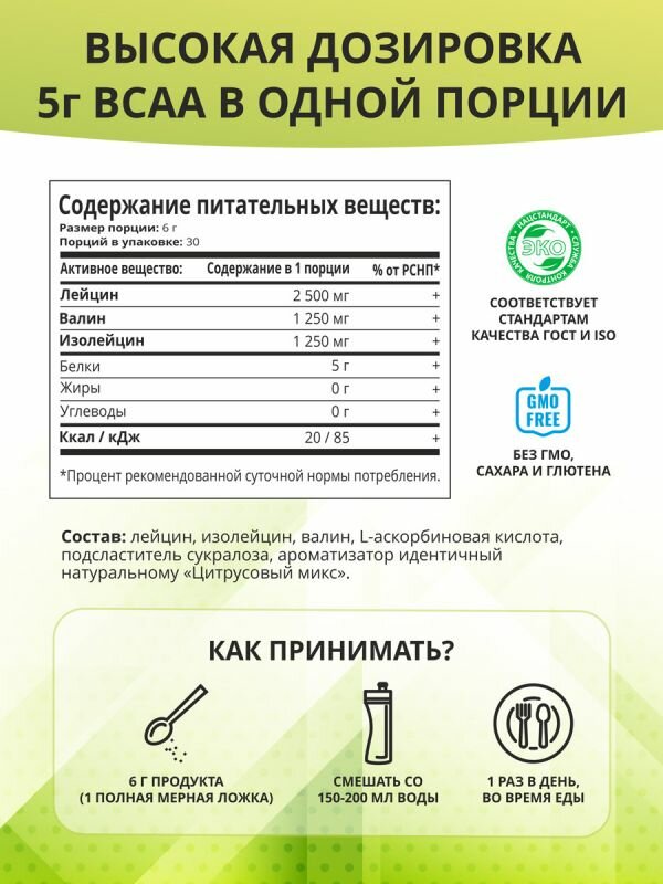 BCAA составляют почти треть от всех аминокислот, находящихся в мышечных тканях тела человека, поэтому они очень важны. Перед тренировкой BCAA можно принимать для повышения выносливости и сохранения мышц. В дни отдыха и после тренировок BCAA способствует скорейшему восстановлению и уменьшает болевой синдром в мышцах.