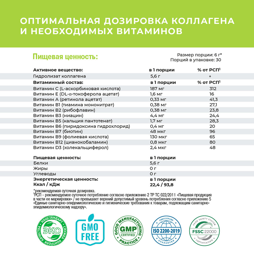 Наш организм нуждается в дополнительном приеме коллагена для здоровых связок, костей и красоты. Кроме того, для наилучшего усвоения и выработки коллагена необходим витамин С. Не является лекарственным средством.