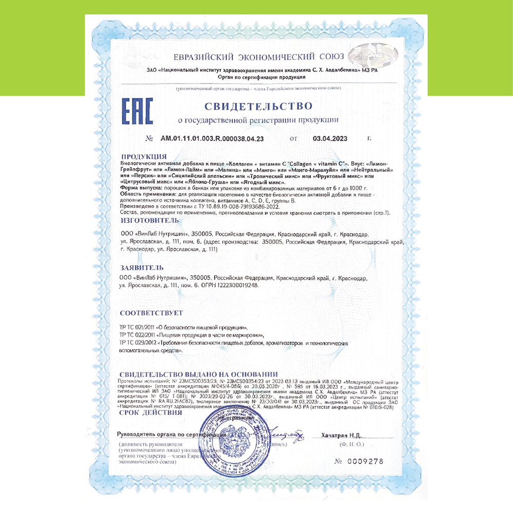 | Состав | гидролизованный говяжий коллаген, L-аскорбиновая кислота, витаминный премикс (L-аскорбиновая кислота, ниацин, кальция пантотенат, DL-α-токоферола ацетат, пиридоксина гидрохлорид, тиамина мононитрат, рибофлавин, ретинола ацетат, фолиевая кислота, биотин, холекальциферол, цианокобаламин), ароматизатор, сукралоза (подсластитель). |