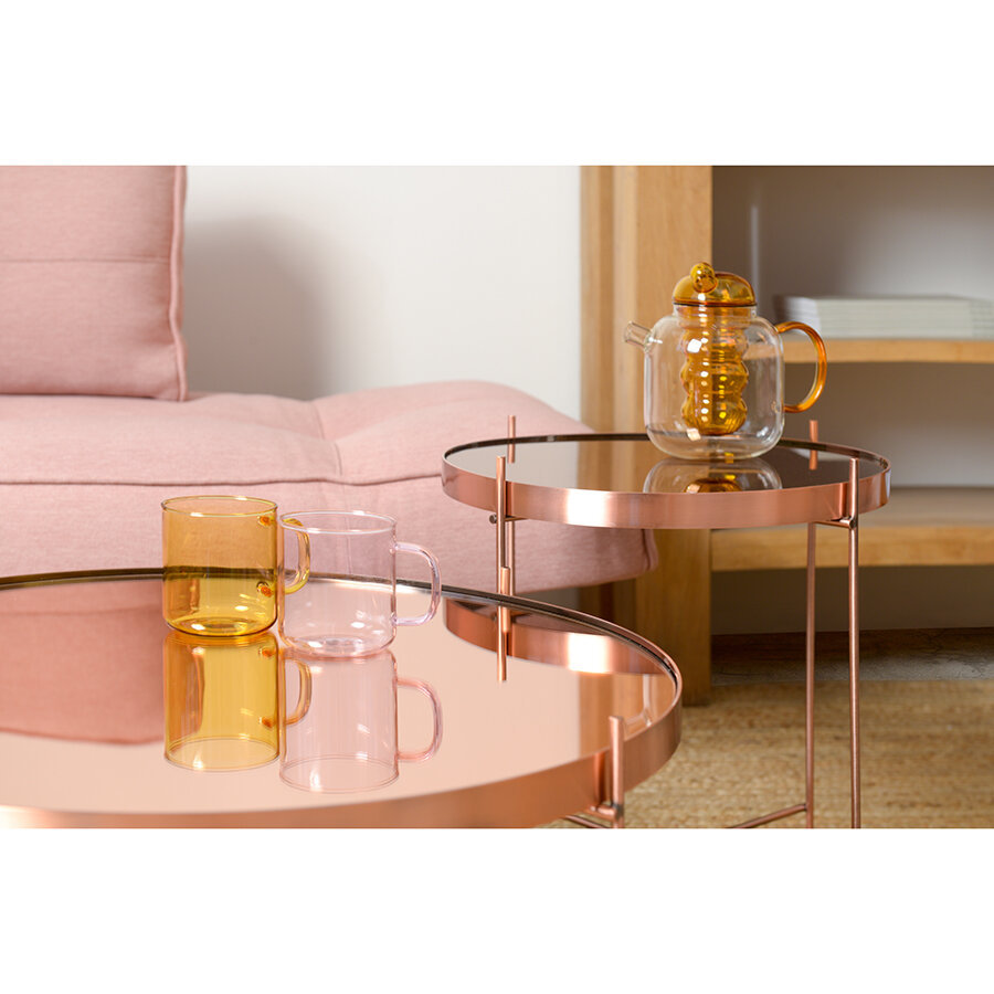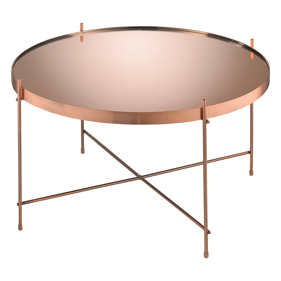 Материалы: столешница – розовое зеркало, каркас – сталь с медным покрытием. Размеры: диаметр – 64,4 см, высота – 38 см.