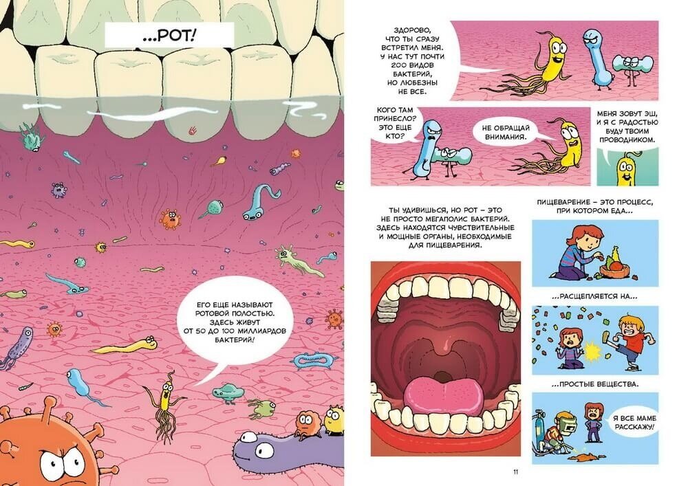Очень забавный и познавательный комикс, увлекает с самых первых страниц. Проиллюстрировно очень интересно, красочно. Думаю книга будет интересна не только детям, но и взрослым. Нравится, что повествование идёт от лица дружелюбно бактерии, она как бы проводник для читателя. С ней можно узнать в лёгкой игриво форме работу желудочно-кишечного тракта.