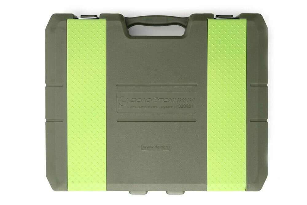 Набор инструментов Дело Техники620851, 151 предмет - включает в себя инструмент с присоединительным квадратом на 1/4”, 3/8”, 1/2”, чтообеспечивает взаимозаменяемость головок и приводов любого из профилей. Таким образом увеличивается количество возможных вариантов подбора требуемой головки с учетом расположения крепежаи выбора привода необходимого размера.Подходит для ремонта автомобиля, мотоцикла и другой техники в гараже, мастерской, поездке или автопутешествии.Преимущества Данный набор имеет самый большой выбор головок и вставок позволяющий решать широчайший спектр задач по ремонту и обслуживанию Наборы инструмента “Дело Техники” разработаны с учетом особенностей устройства и ремонтасовременных автомобилей. Продуманная раскладка комплектующих стала более логичной, чтоускоряет поиск инструмента Все инструменты отличаются продолжительным сроком службы, так как изготовлены из высококачественной прочной хромванадиевой стали Пластиковый кейс с яркими накладками для удобства транспортировки и хранения набора Дело Техники620851