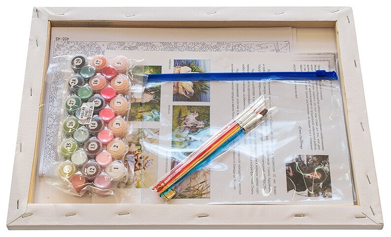 | Комплектация | Холст на подрамнике с пронумерованной схемой, Контрольный лист, Набор акриловых красок, Кисти – 4 шт., Крепление для готовой картины, Пакет с zip-застежкой 23 х 17,5 см; Листовка о художнике |