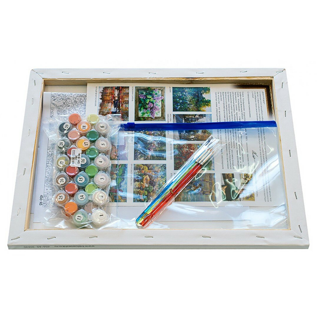 | Комплектация | Холст на подрамнике с пронумерованной схемой, Контрольный лист, Набор акриловых красок, Кисти – 4 шт., Крепление для готовой картины, Пакет с zip-застежкой 23 х 17,5 см; Листовка о художнике |