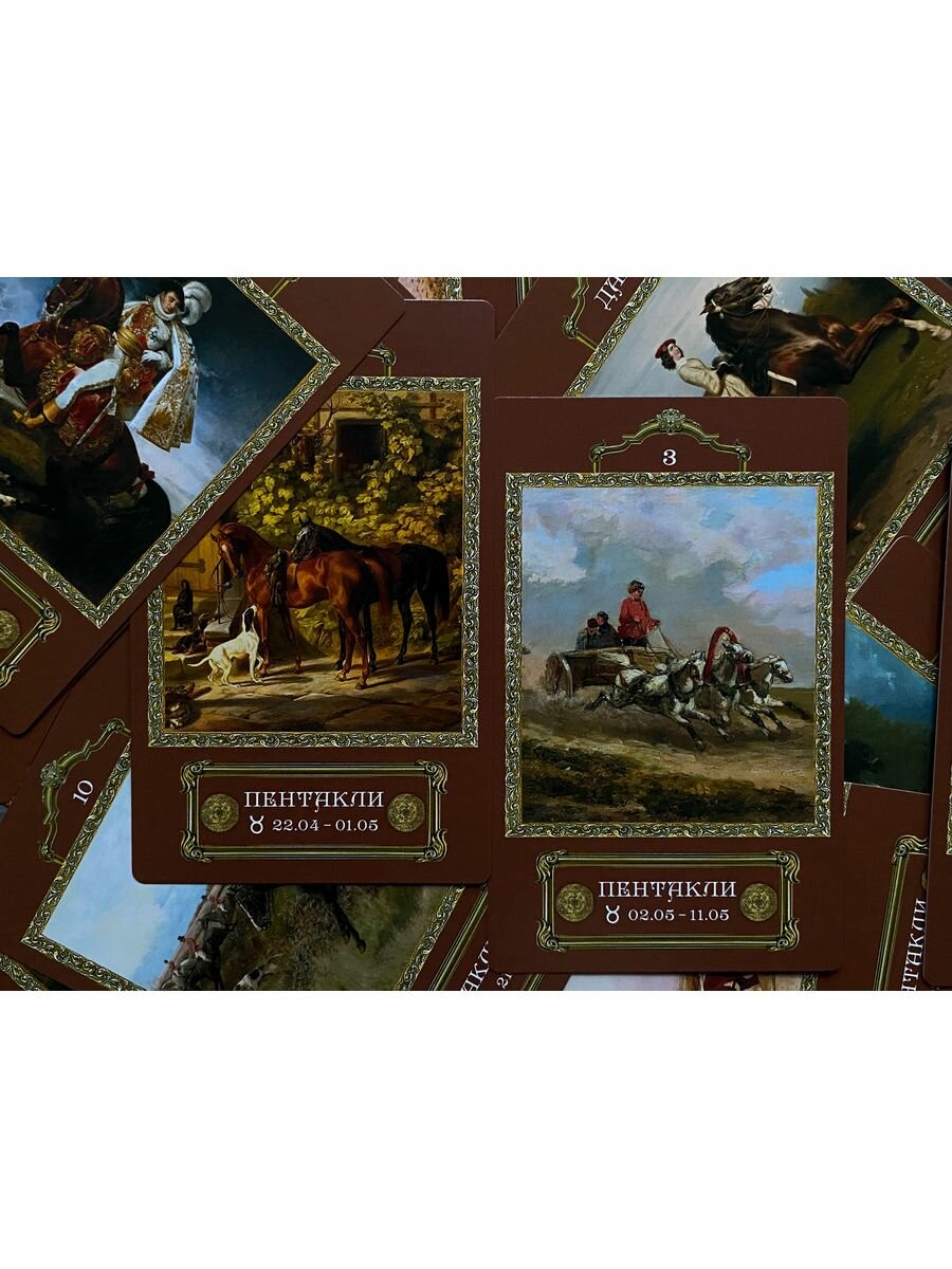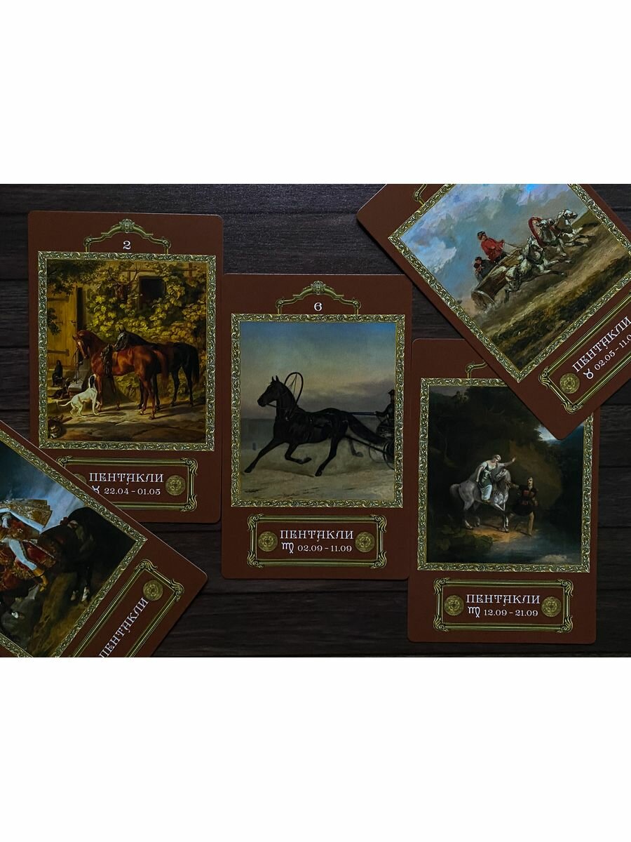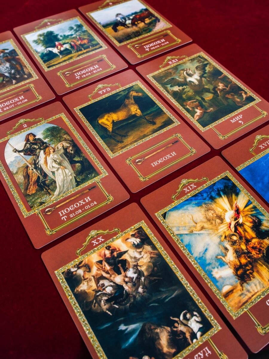 Арканы - картины разных художников и эпох с участием лошадей. Задумка интересная, но всё убила бумага вместо картона и сумбурные МА.