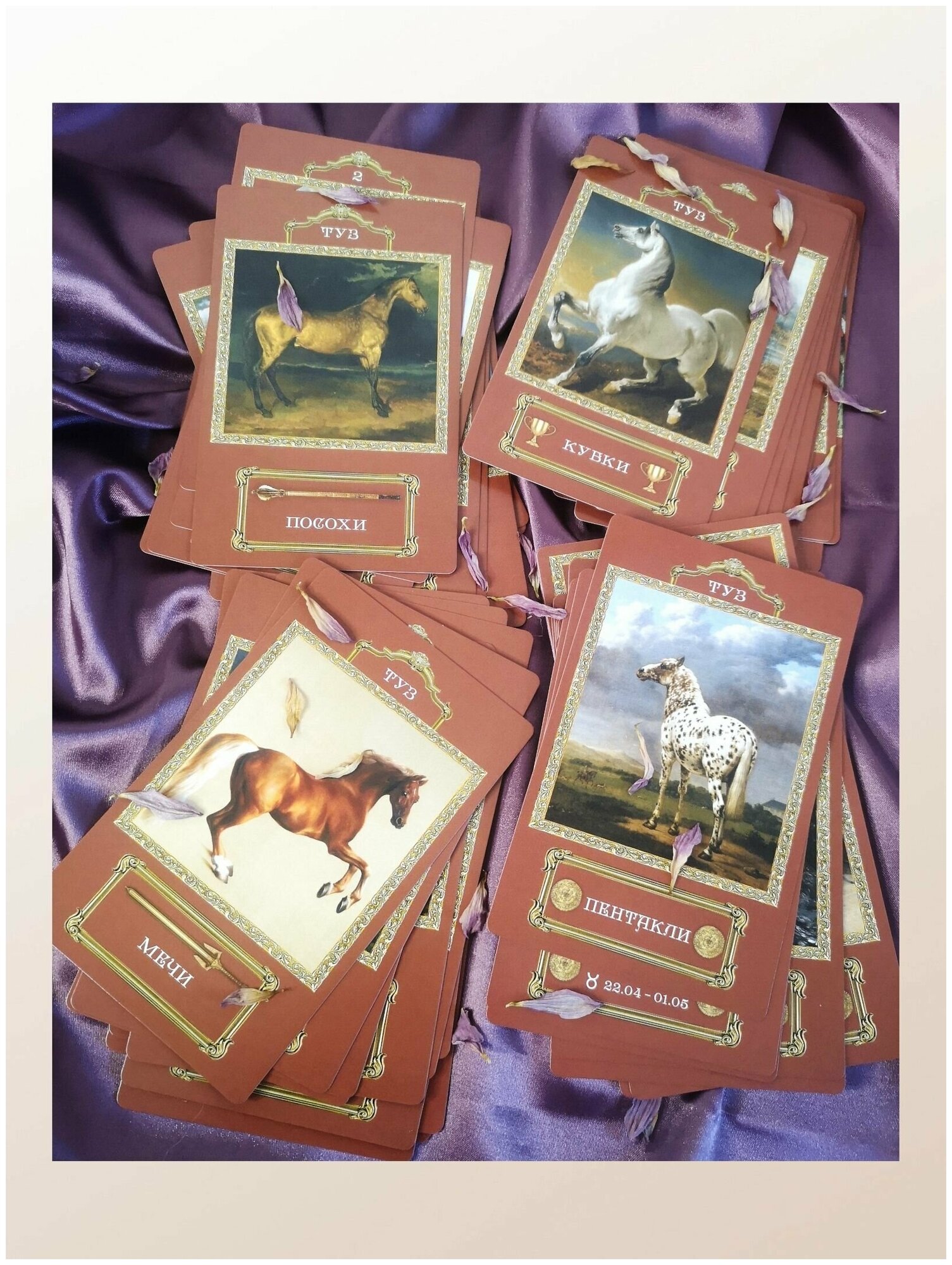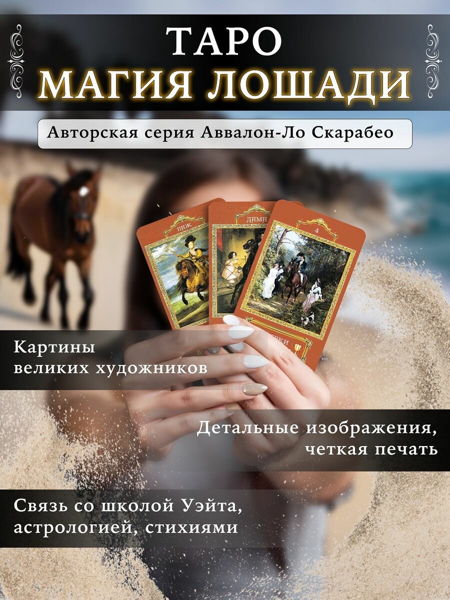 Эта колода может быть интересна как тарологам любого уровня, так и просто любителям лошадей, ведь на каждой карте вы увидите этих великолепных, гордых и очень красивых животных.
