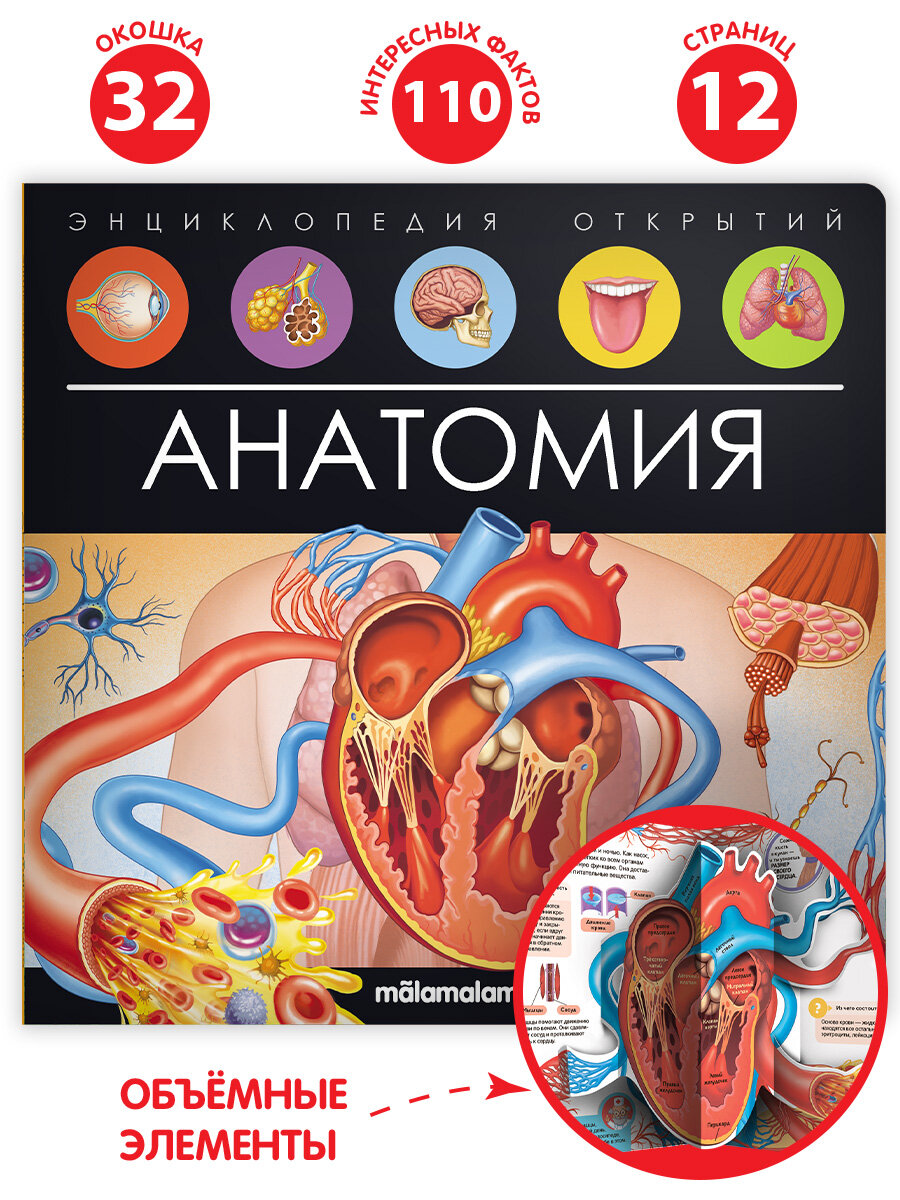 Книги из серии «Энциклопедия открытий» от торговой марки Malamalama — это набор настоящих энциклопедий на все популярные темы. Книга «Анатомия» рассказывает об устройстве тела человека, о физиологических процессах и строении органов. Объёмные POP-UP конструкции и красочные иллюстрации сделают изучение запоминающимся и лёгким.
