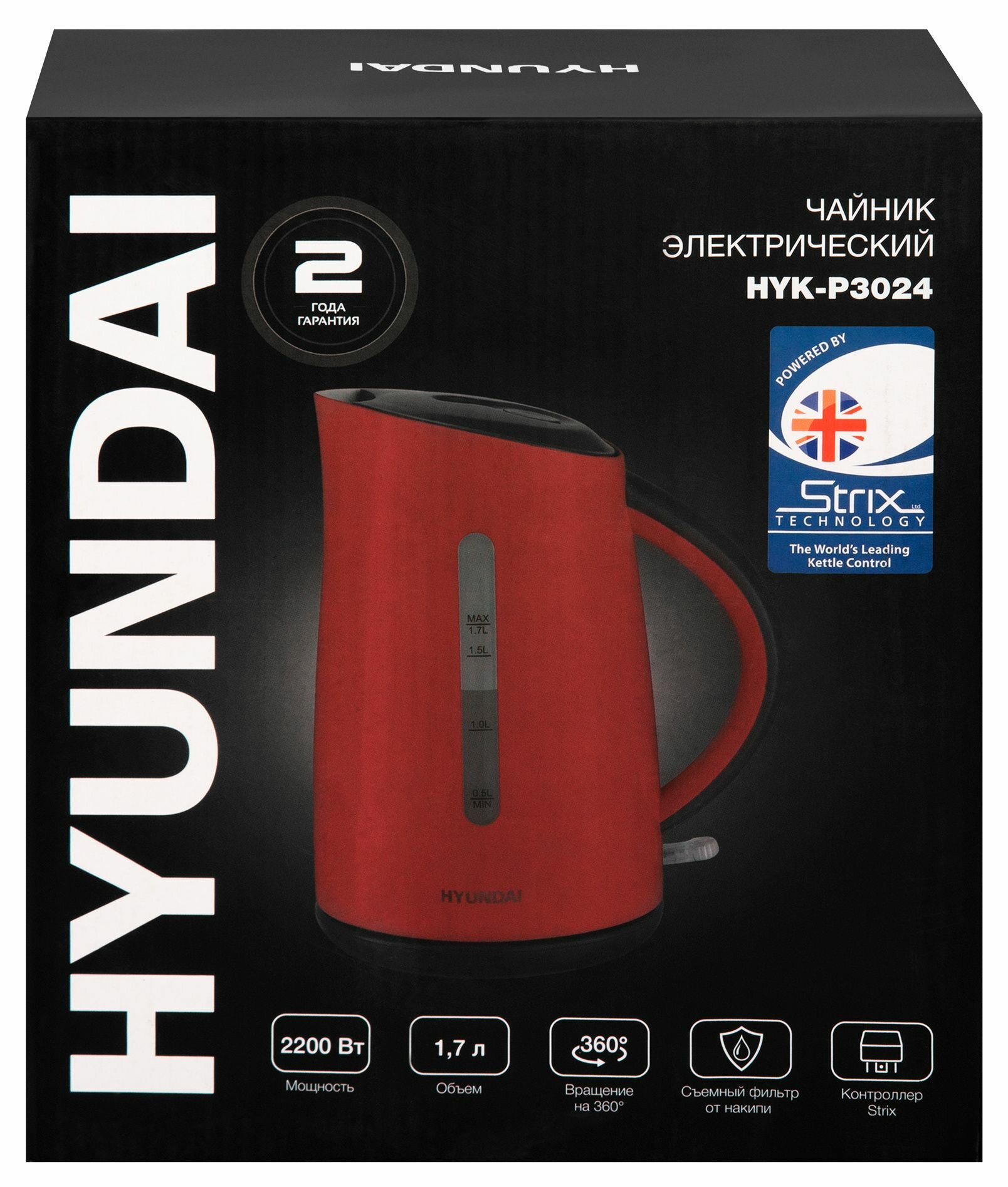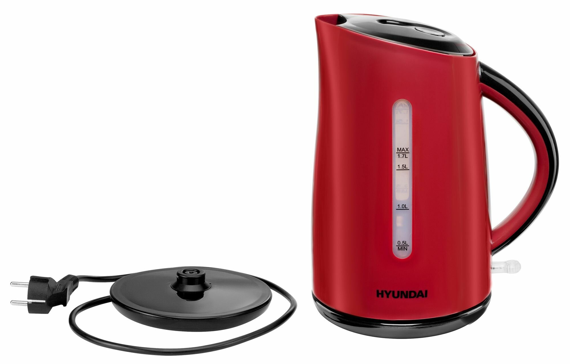 Чайник электрический Hyundai HYK-P3024 красный/черный, объём 1.7л, мощность 2200Вт, материал корпуса: пластик