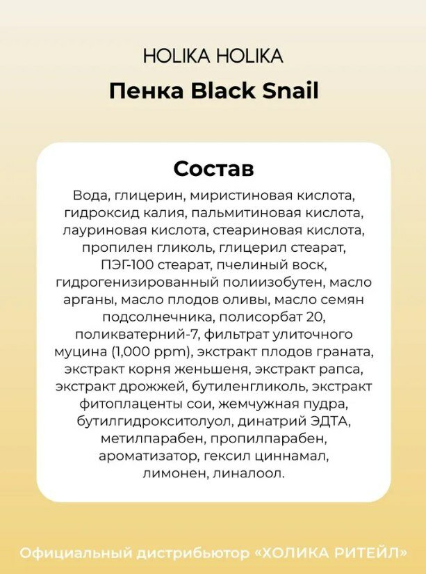 | Состав | WATER, GLYCERIN, MYRISTIC ACID, POTASSIUM HYDROXIDE, PALMITIC ACID, LAURIC ACID, STEARIC ACID, PROPYLENE GLYCOL, GLYCERYL STEARATE, PEG-100 STEARATE, BEESWAX, HYDROGENATED POLYISOBUTENE, ARGANIA SPINOSA KERNEL OIL, OLEA EUROPAEA (OLIVE) FRUIT OIL, HELIANTHUS ANNUUS (SUNFLOWER) SEED OIL, POLYSORBATE 20, POLYQUATERNIUM-7, SNAIL SECRETION FILTRATE(1,000 ppm), Punica Granatum Fruit Extract, Panax Ginseng ROOT Extract, Brassica Napus Extract, YEAST EXTRACT, BUTYLENE GLYCOL, GLYCINE SOJA (SOYBEAN) PHYTOPLACENTA EXTRACT, PEARL POWDER, BHT, DISODIUM EDTA, METHYLPARABEN, PROPYLPARABEN, FRAGRANCE, HEXYL CINNAMAL, LIMONENE, LINALOOL |