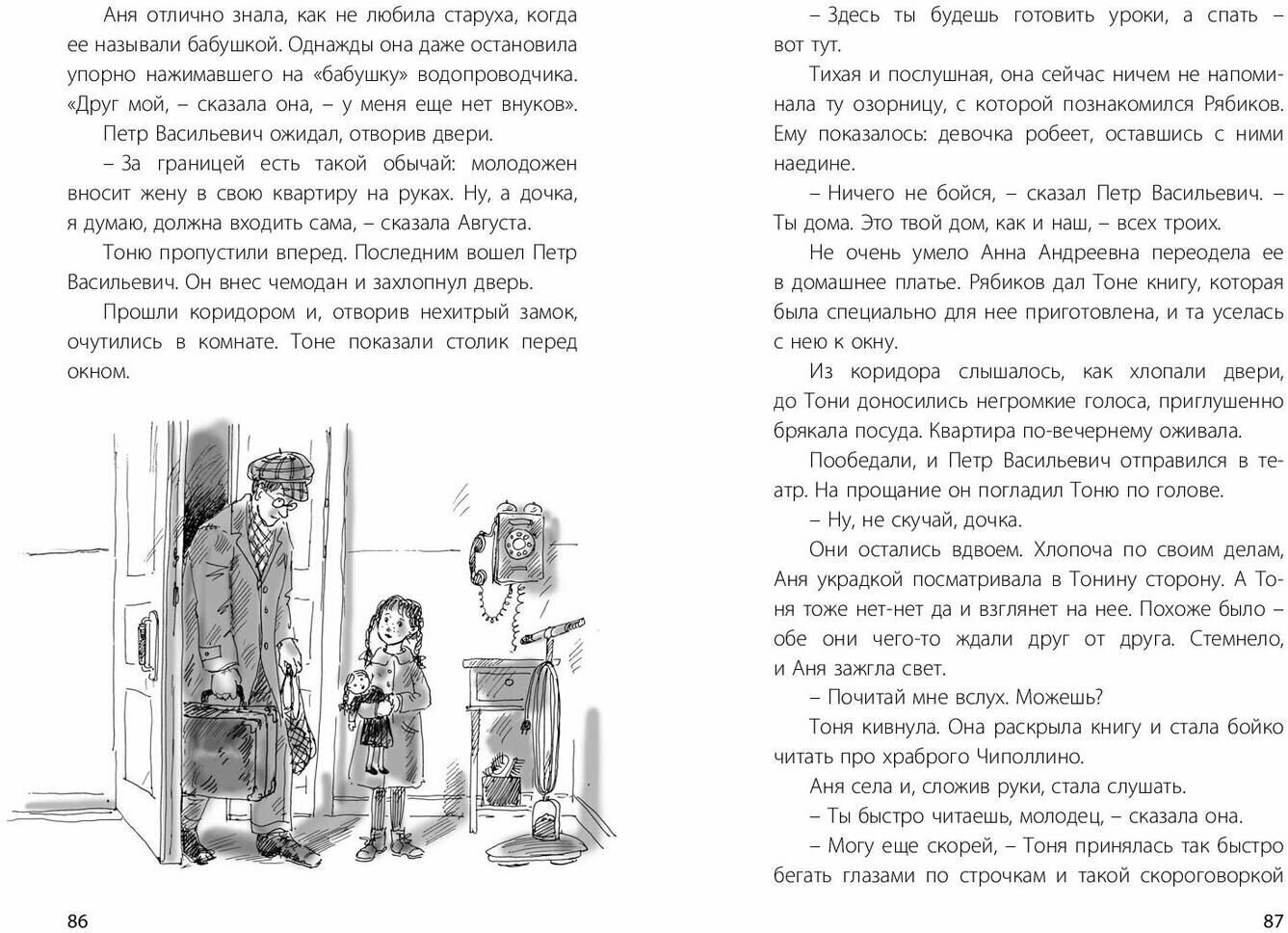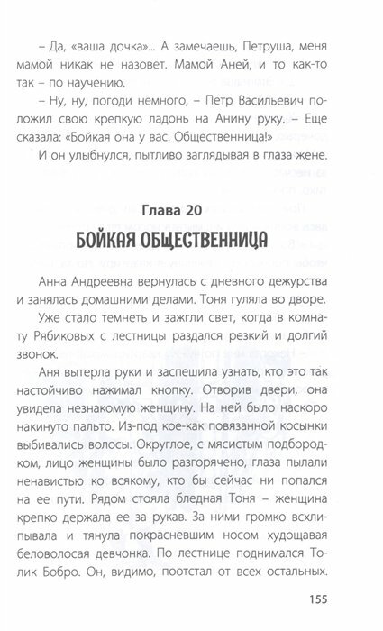 Есть детские книги, которые надо бы читать и взрослым. К таким относится и эта. О девочке из детдома, которую удочерила бездетная семья, живущая в коммунальной квартире. Тоня привыкла к коллективу , к дому, где"все для всех". И ей не понятно, как это предметы могут принадлежать только кому-то одному. Она старается изо всех сил быть хорошей, но за все, что она делает ей попадает. И все -таки эта маленькая девочка сплотила всех живущих в этой квартире. Как ей это удалось? Прочитайте книгу и узнаете. Желаю приятного чтения! После этой книги захотелось еще раз посмотреть фильм с детьми.