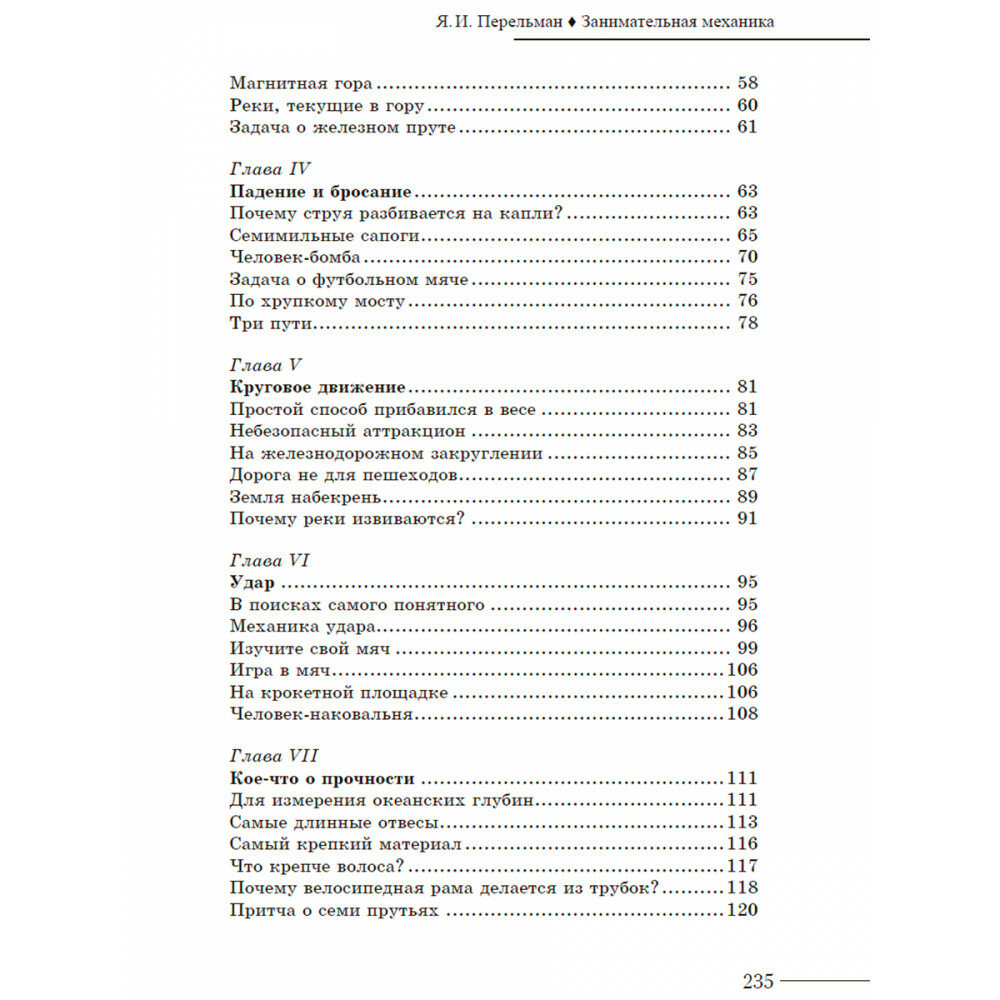 В чем заключаются основные законы механики? Как разрешить спор Коперника и Птолемея о движении Земли? Как надо понимать закон инерции? Как должно двигаться тело, на которое неизменно действует одна и та же сила? Когда горизонтальная линия не горизонтальна? Почему струя разбивается на капли? Почему реки извиваются? Как высоко может подпрыгнуть мяч, если его уронить с Эйфелевой башни? Какой груз выдерживает человеческий волос? Почему солома и стружки оберегают вещи от поломок? Какой путь может пройти автомобиль с выключенным мотором? Почему бегемот неуклюж? Отчего деревья не растут до неба?