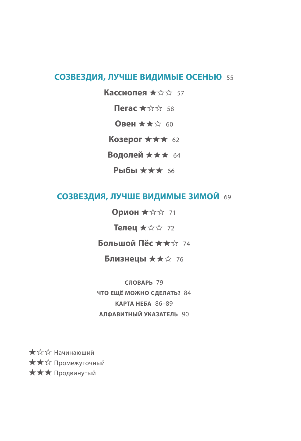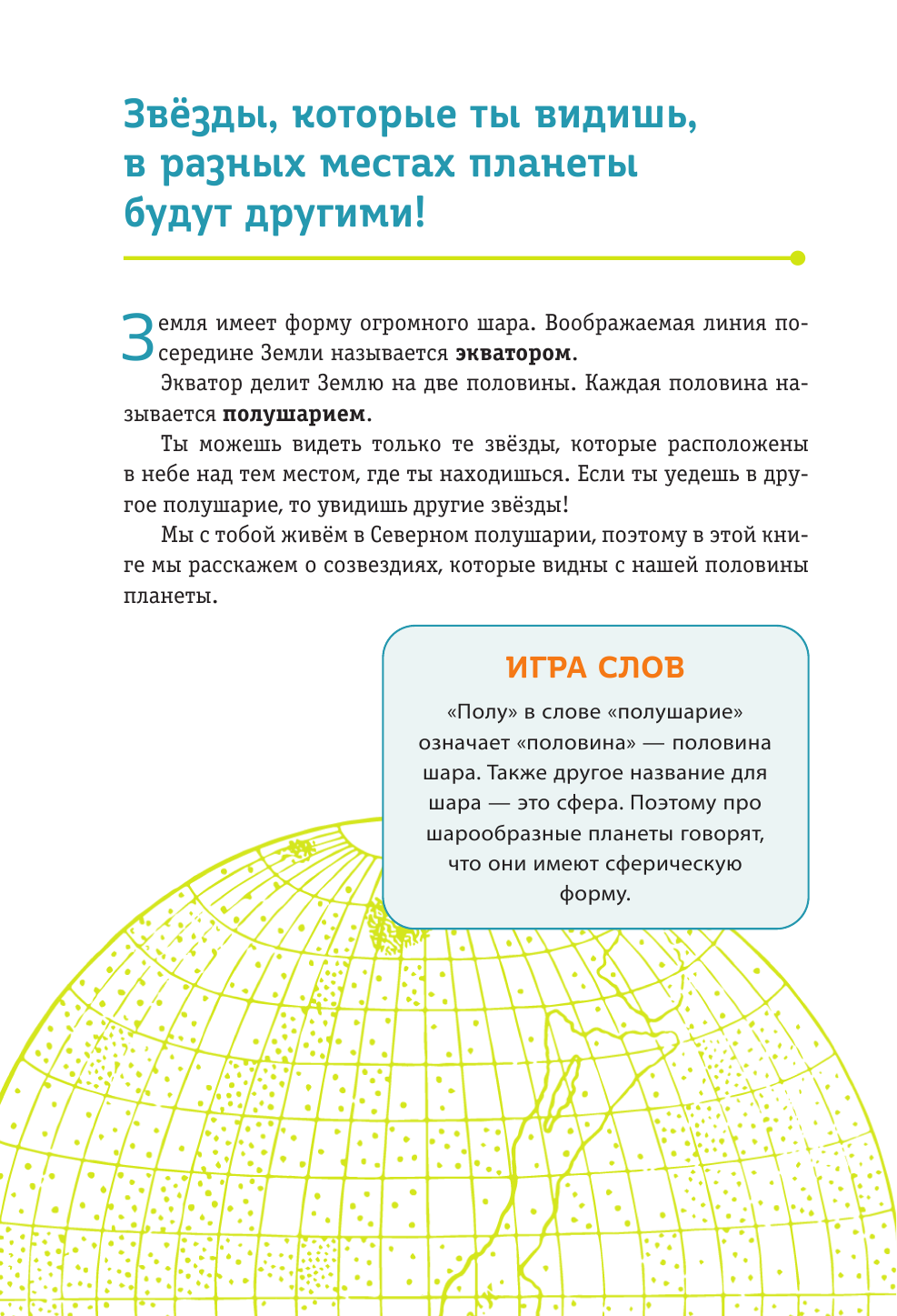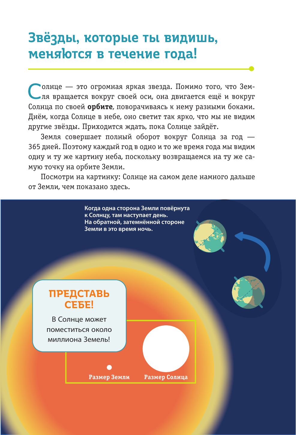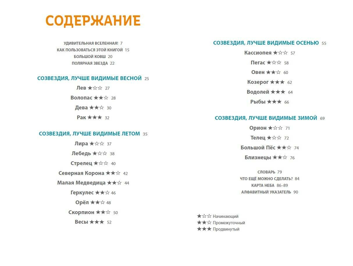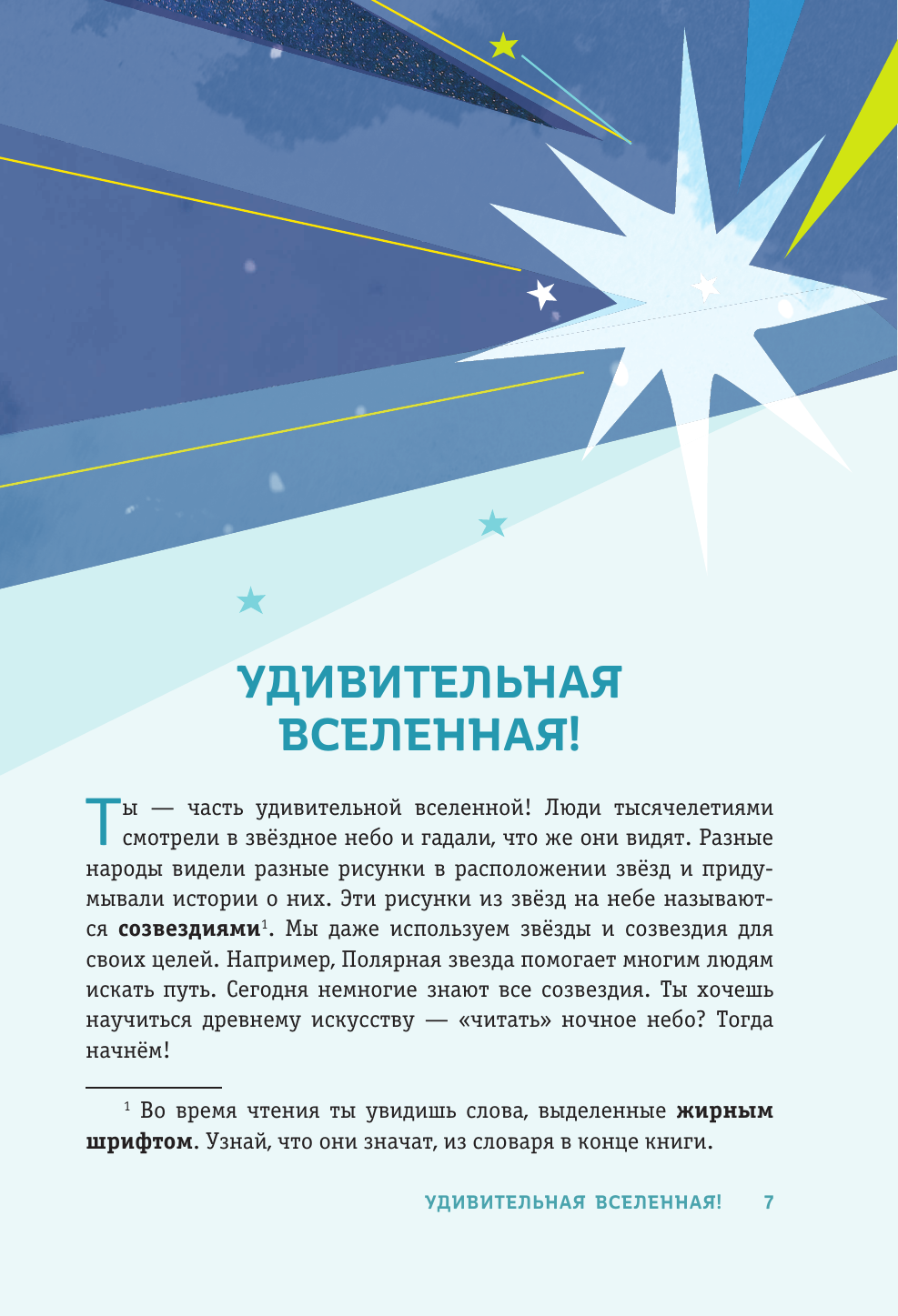 Книгу покупала для ребенка 8 лет. Поскольку ребенок мечтает о телескопе, то решили для начала 'изучить' теорию. Яркие иллюстрации, доступное изложение. Описано как найти то или иное созвездие, как ориентироваться по сторонам света, в какое время года и где искать. Рекомендую к прочтению и детям постарше.