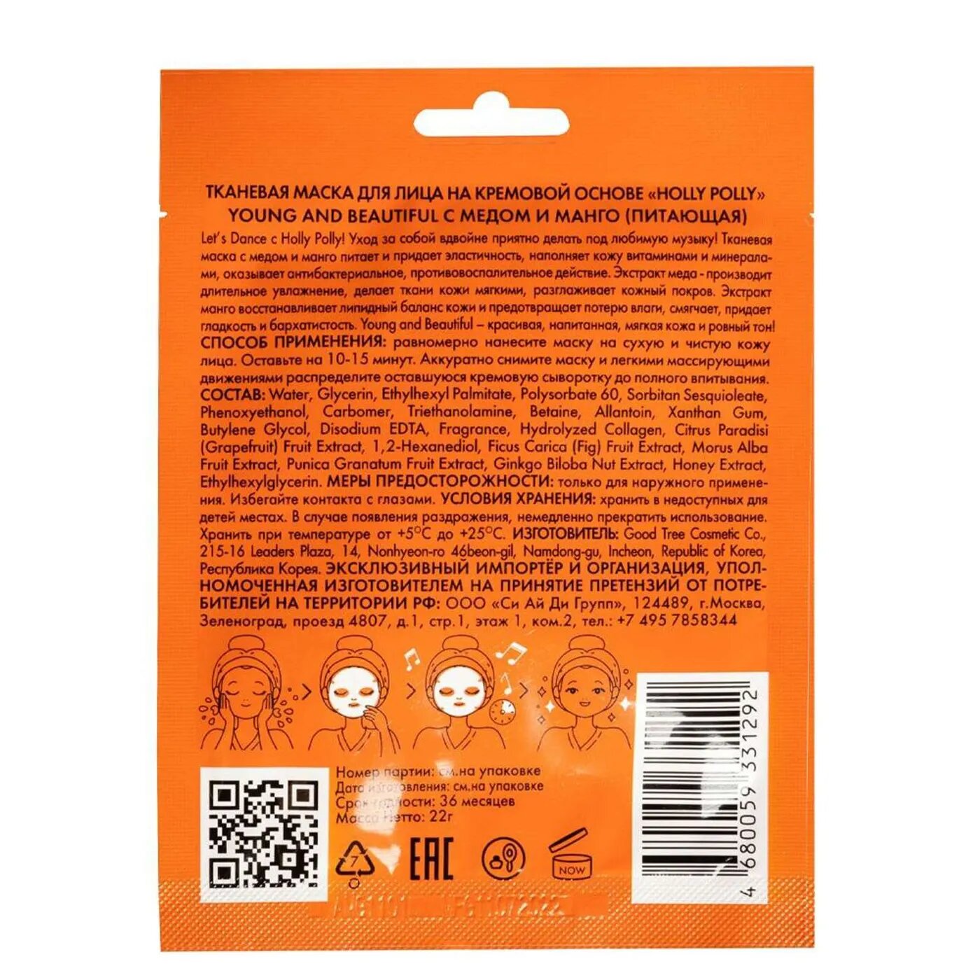 Holly Polly Питающая тканевая маска с медом и манго Young and Beautifu на кремовой основе 22 г (Holly Polly ) (ЭХ99989429479)