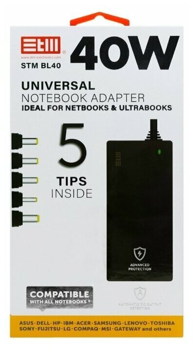 STM – компактный блок мощностью 40 Вт, который подойдёт для ноутбуков, которым не требуется мощный источник питания. Поэтому основное преимущество STM это скромные габариты и малый вес. Он легко поместится в рюкзаке или сумке. В комплекте с STM поставляется 5 переходников под разные модели ноутбуков.