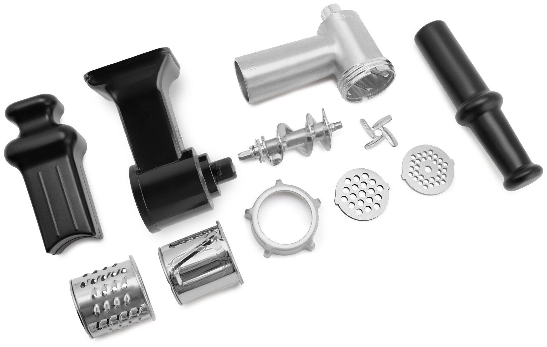Для безопасности использования в комплекте прилагается толкатель для погружения продуктов в мясорубку. Прорезиненные ножки обеспечивают устойчивость прибора. В комплекте инструкция по эксплуатации.