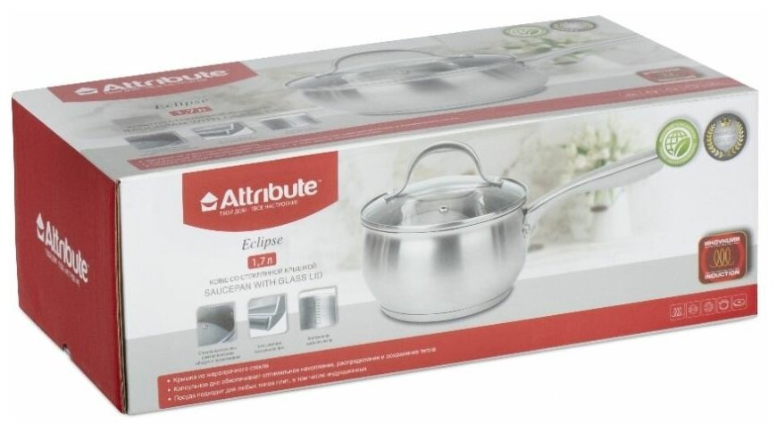 Ковш для приготовления торговой марки ATTRIBUTE выполнен из нержавеющей стали с высокими антикоррозийными свойствами. При приготовлении блюд посуда обеспечивает равномерное распределение тепла и быстрый нагрев содержимого, избегая пригорания пищи. В них предусмотрен внутренняя шкала определения объема жидкости. Крышка из жаропрочного стекла с отверстием для отведения пара выдерживает резкий перепад температур и обладает высокой термоустойчивостью. Ковш изготовлен из экологически чистой стали, соответствует нормам, позволяющим контактировать с пищей. Можно мыть в посудомоечной машине