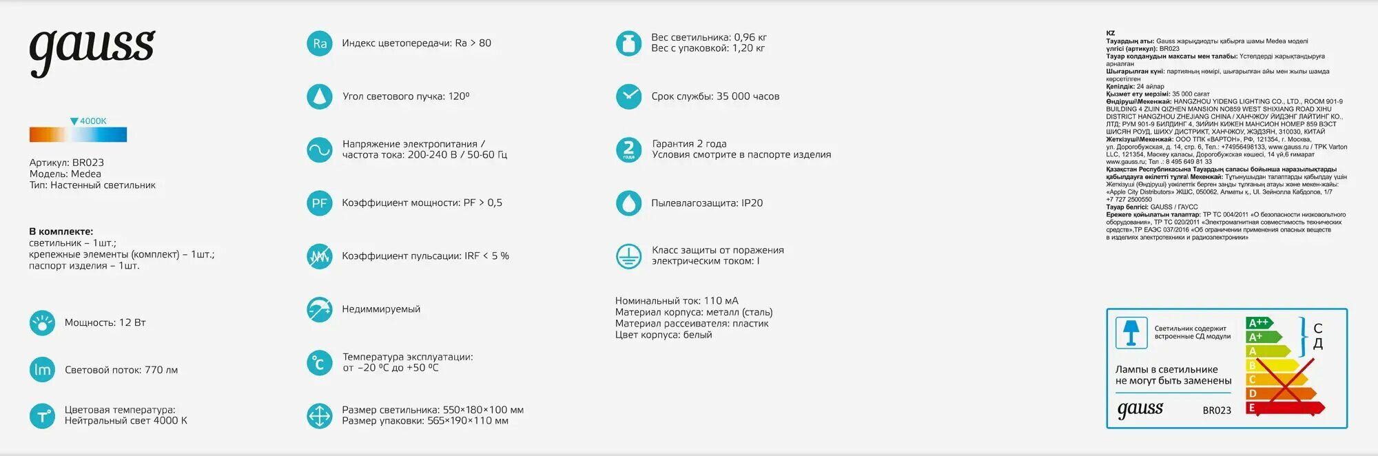 | Цвет освещения | Нейтральный белый |