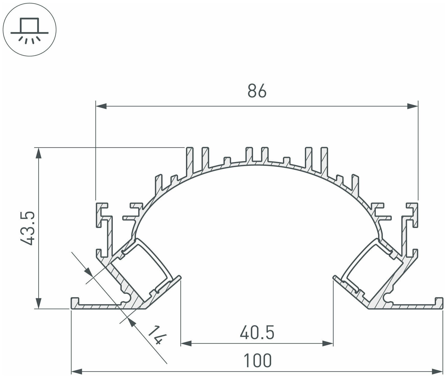Встраиваемый профиль с накладным фланцем из анодированного алюминия с двусторонним боковым свечением с эффектом «объемного света» для создания широких световых полос. Габаритные размеры профиля составляют 2000 мм в длину, 100 мм в ширину и 43,5 мм в высоту. Площадки для установки светодиодных лент позволяют использовать ленты шириной до 14 мм и мощностью до 33 Вт/м каждая. Это обеспечивает гибкость в выборе светодиодных лент и создает потрясающие световые решения. Отличное решение для создания современных световых проектов.