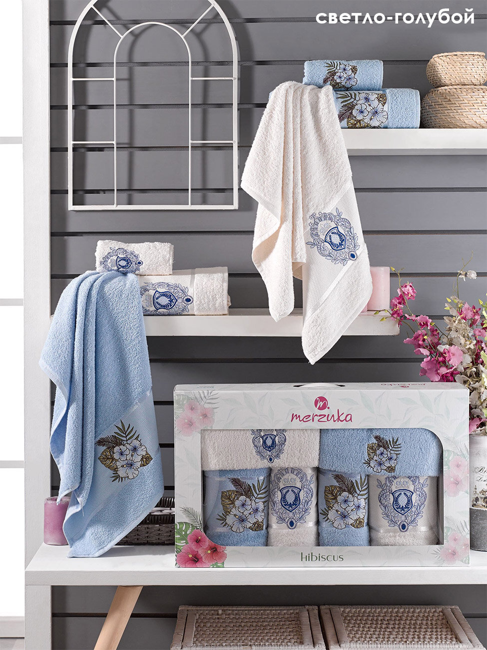 Очаровательный комплект пушистых полотенец серии Hibiskus дополнит отдых своим роскошным дизайном и особой нежностью мягкой хлопковой махры. В комплект входят шесть полотенец в двух дизайнах вышивки. Ворс обладает оптимальной плотностью, прекрасно впитывает влагу и достаточно быстро сохнет. Каждое полотенце с одной стороны украшено широким тканевым бортиком с вышивкой и атласными кантиками.