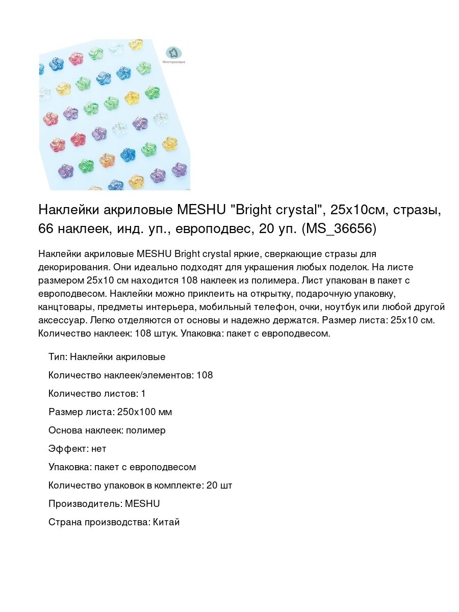 Сервис сравнения цен СкидкаГИД предлагает сравнить цены на товар «Наклейки акриловые MESHU "Bright crystal" 25*10см стразы 66 наклеек (MS_36656)»
