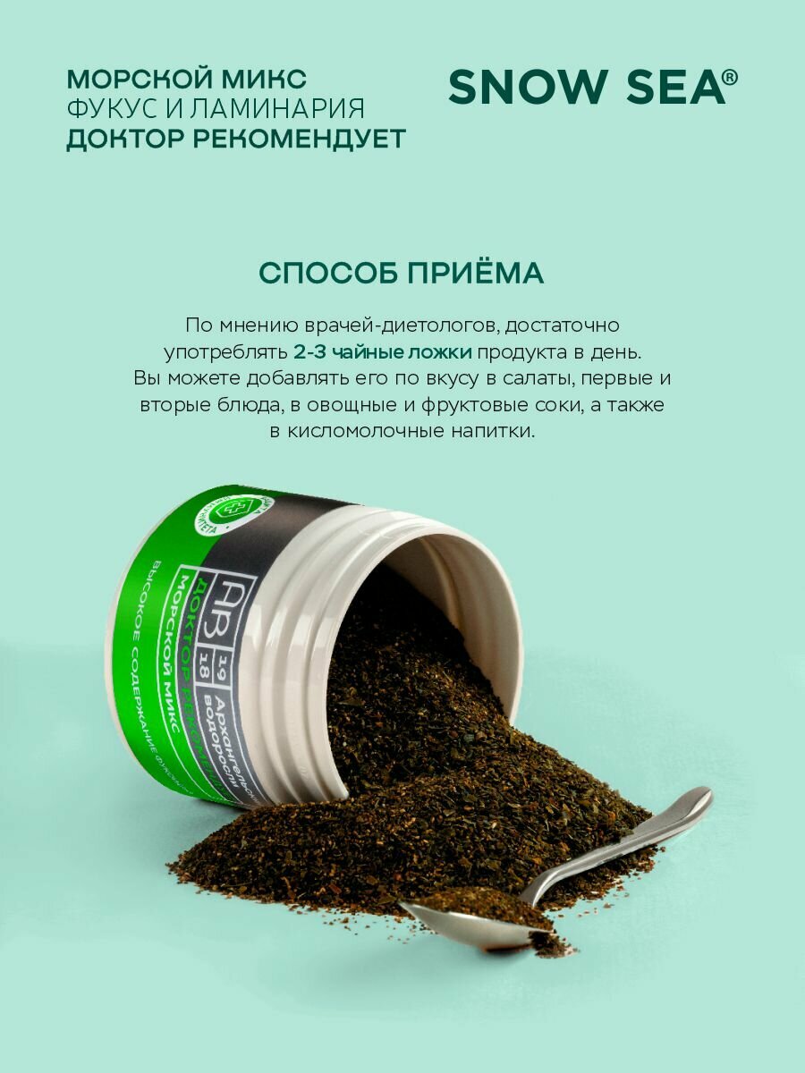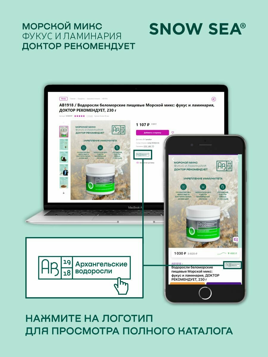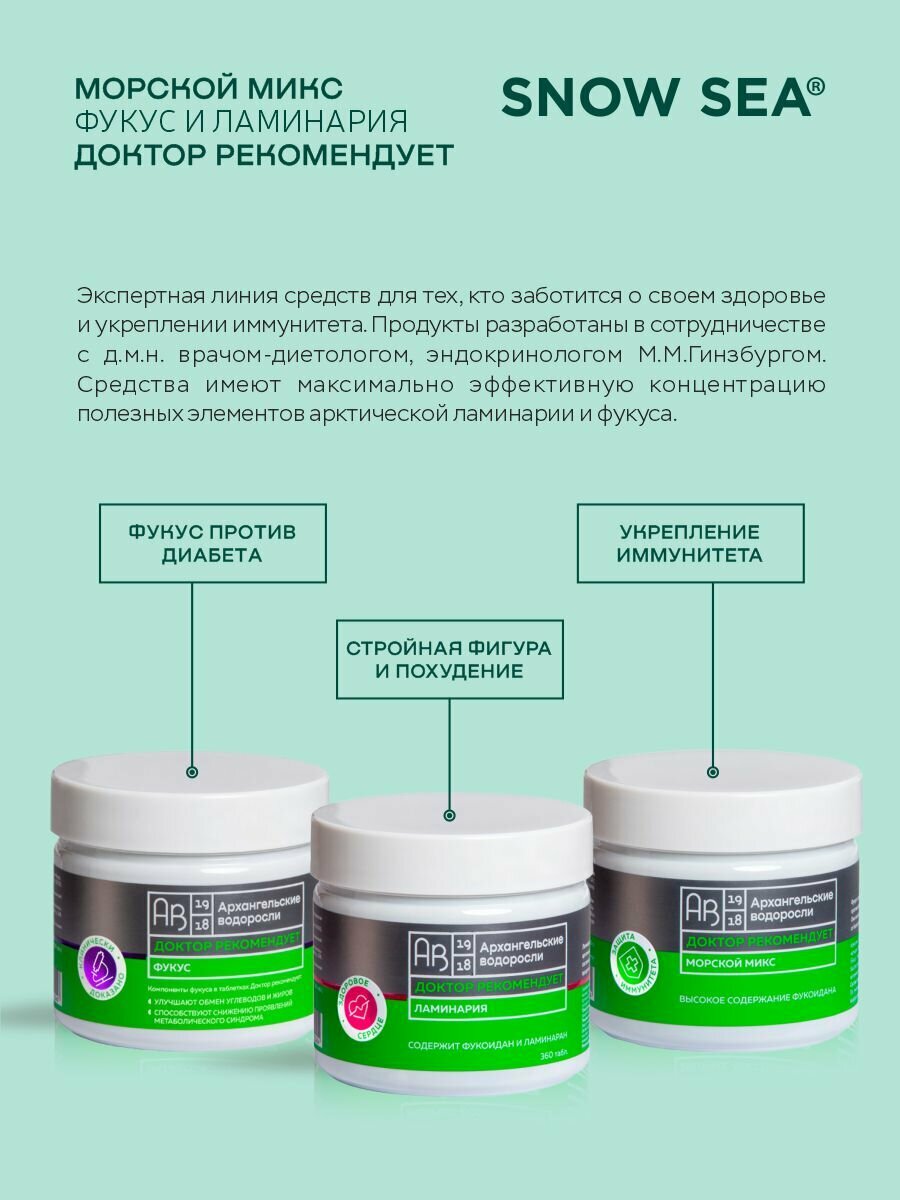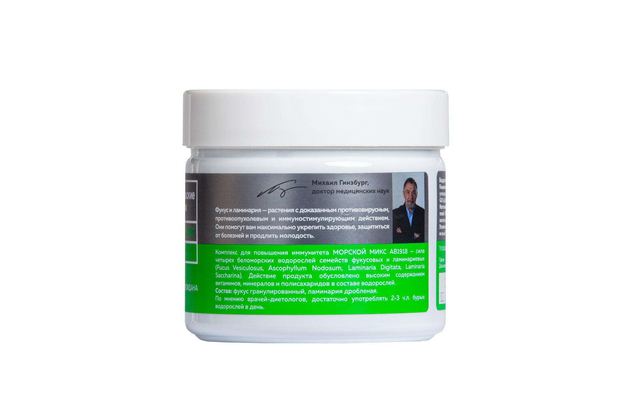 Экспертная линейка ДОКТОР РЕКОМЕНДУЕТ АВ1918 разработана совместно с доктором медицинских наук, врачом-диетологом, эндокринологом М.М. Гинзбургом.Комплекс для повышения иммунитета МОРСКОЙ МИКС АВ1918 - сила четырех беломорских водорослей семейств фукуса и ламинарии (Fucus Vesiculosus, Ascophyllum Nodosum, Laminaria Digitata, Laminaria Saccharina). Оздоровительное и иммуностимулирующее действие продукта связано с высоким содержанием витаминов, минералов и полисахаридов в составе водорослей.Комплекс МОРСКОЙ МИКС АВ1918 содержит витамины А, С, D, E и группы B, незаменимые аминокислоты, Омега-3 полиненасыщенные жирные кислоты, полисахариды (альгинат, ламинаран, фукоидан) и минералы (йод, кальций, калий, селен, магний, железо, цинк и др.)По мнению врачей-диетологов, с целью комплексного оздоровления и для поддержания иммунитета достаточно употреблять 2-3 чайных ложки беломорских бурых водорослей в день.