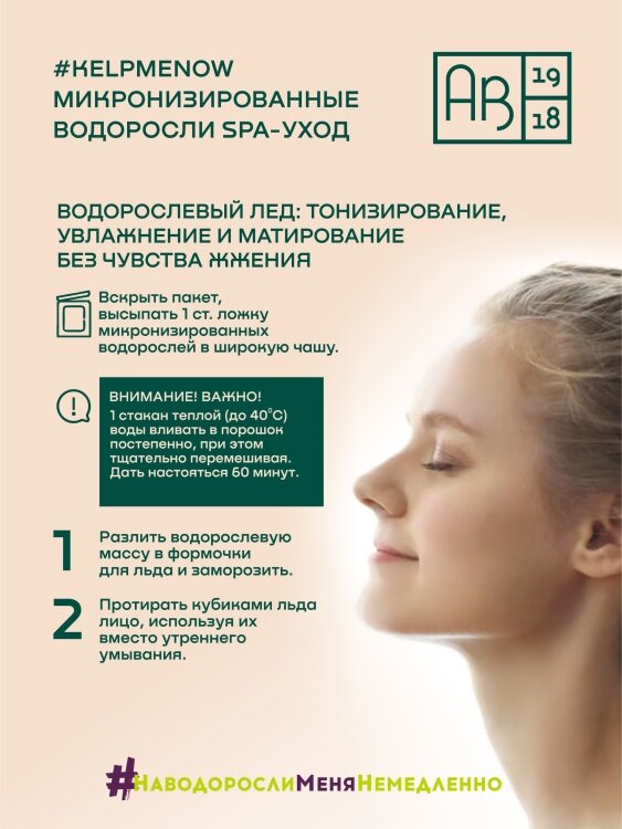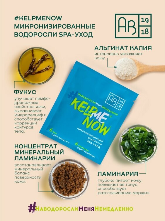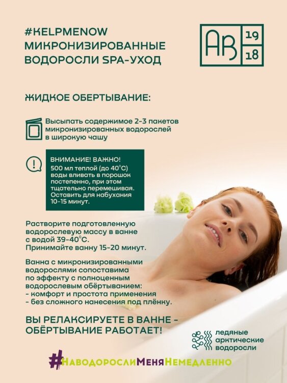 Микронизированные водоросли SPA-УХОД #KELPMENOW представлены в виде порошка из сухих водорослей с добавлением водорослевых субстанций АВ1918. Расфасованы в одноразовые саше по 50г (6 саше в одной коробке). Одно саше – одна SPA-процедура на выбор: тонизирование водорослевым льдом, маска для лица и зоны декольте, обертывание проблемных зон, SPA-ванна тонизирующая, SPA-ванна релаксирующая, жидкое термообертывание.